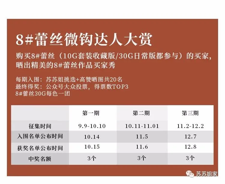 奖品为价值七百多元的苏苏姐家8#蕾丝80团(30克装)!!!