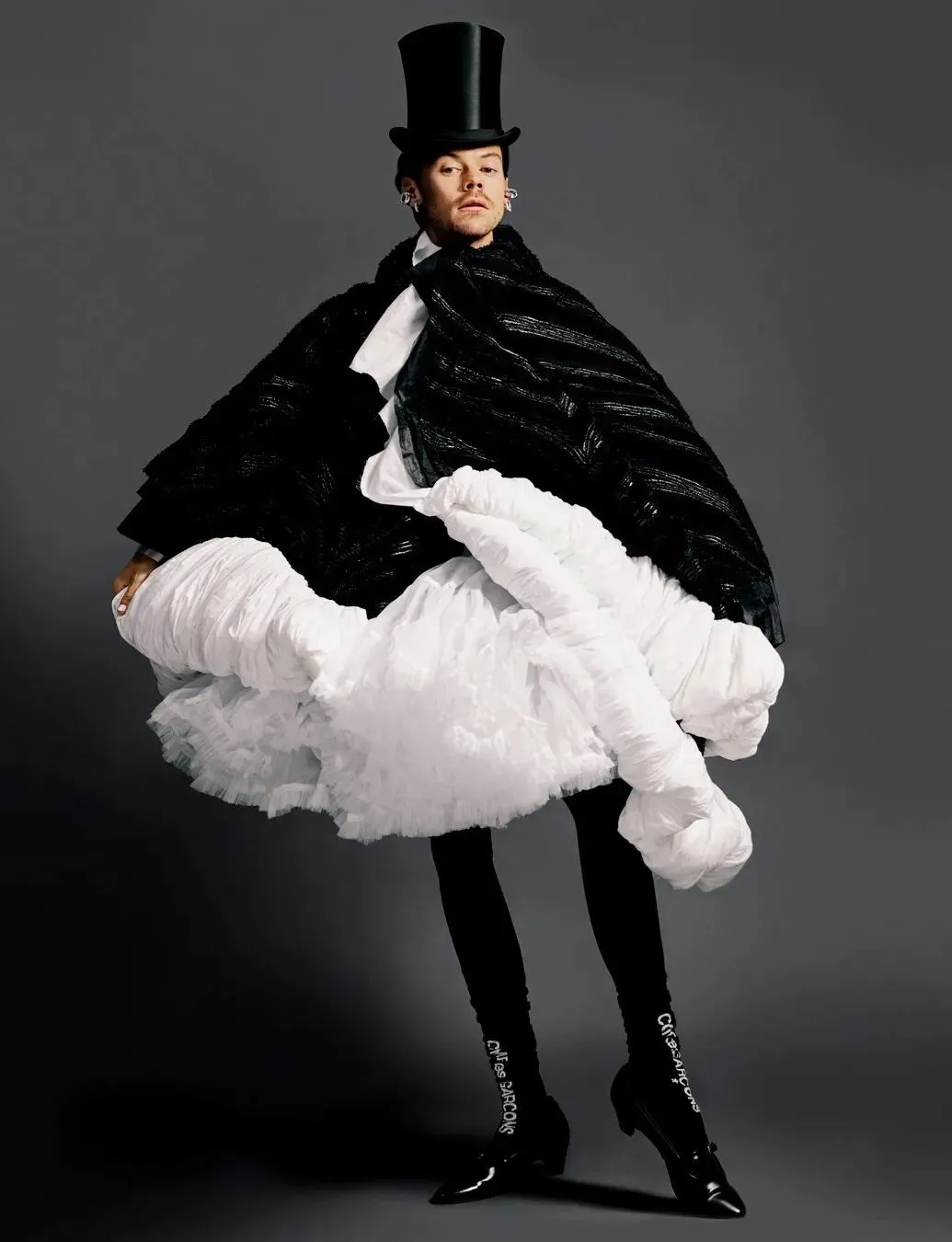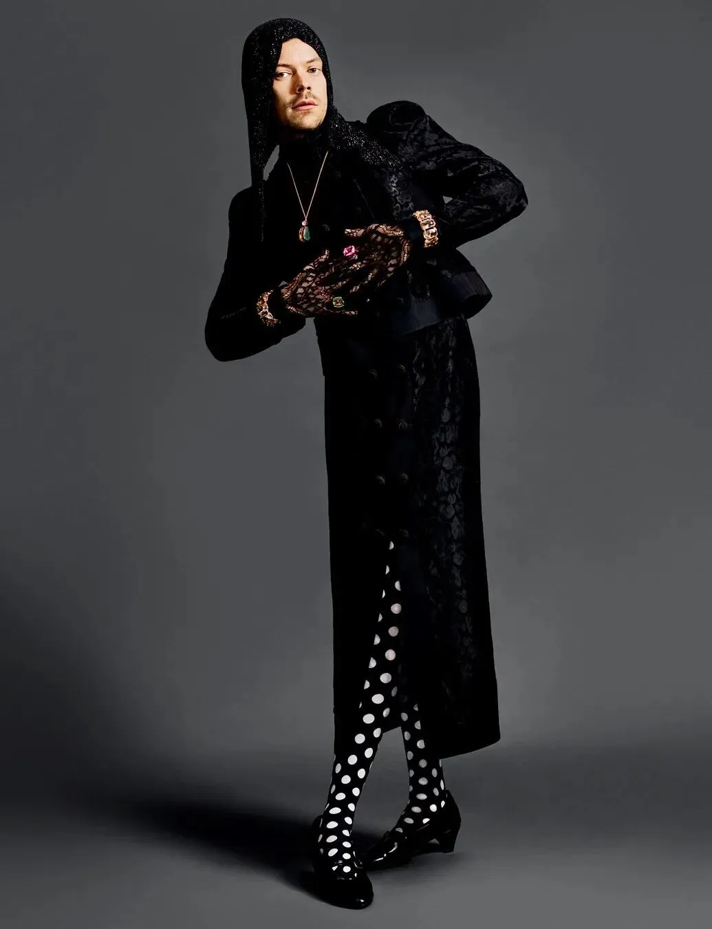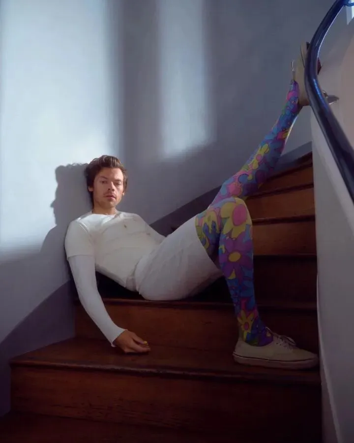 作为时尚圈的宠儿,Harry敢穿着长裙礼服上封面,也敢穿着裤袜拍大片,每一步都稳准狠地踩在霸权式男性气概(hegemonic masculinity)的痛点上,哈卷却显得丝毫不介意「女装」会削弱自己的男性特质