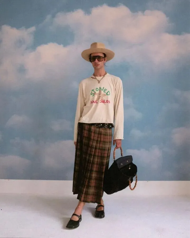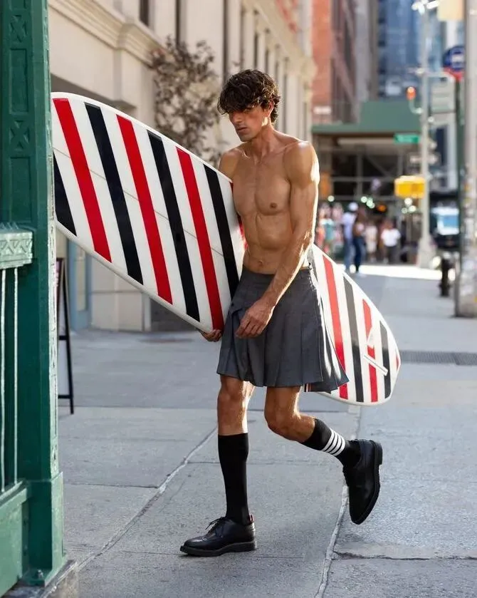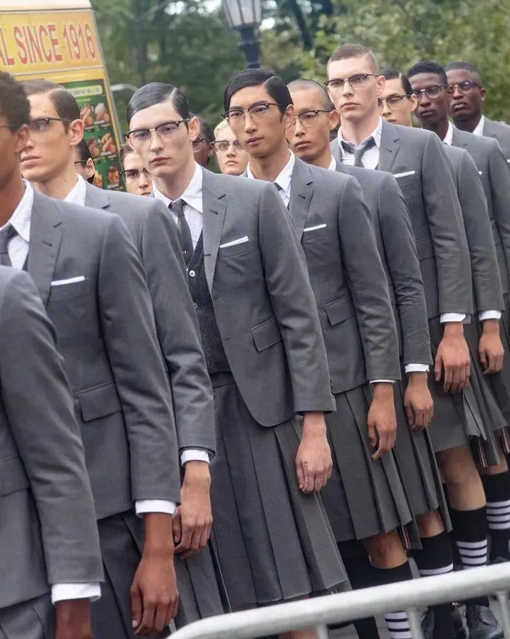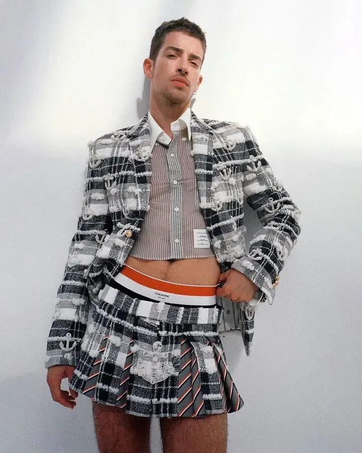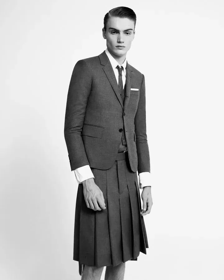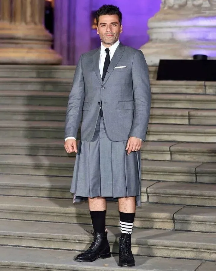 很多品牌都有推出过男士半裙,像是因时髦制服而出出圈的Thom Browne就很有意思,他们选择着装的男艺人有像帅大叔型的Oscar Isaac(电影《沙丘》中扮演甜茶的父亲),或是花美男型的Manu Rios,亦是风骚亦是风雅,是谁说男人穿裙子就是伤风败俗呢?