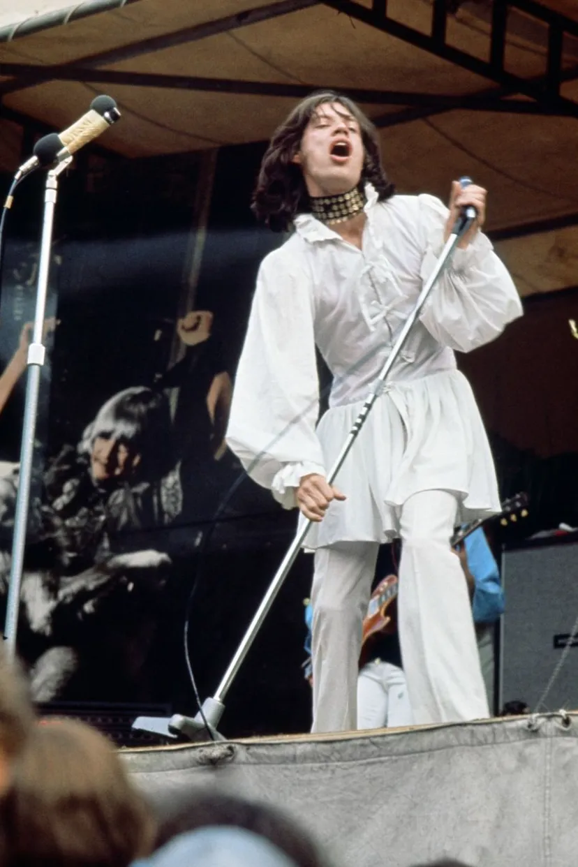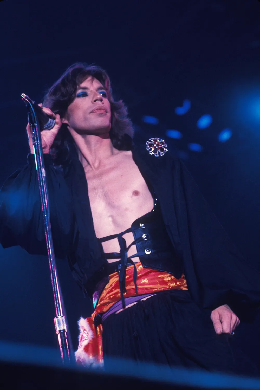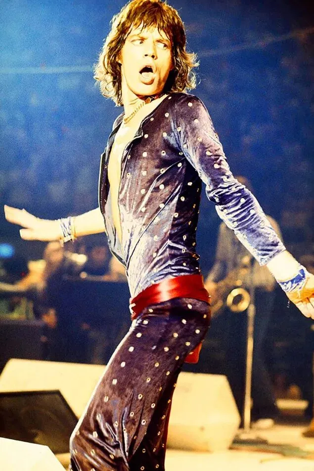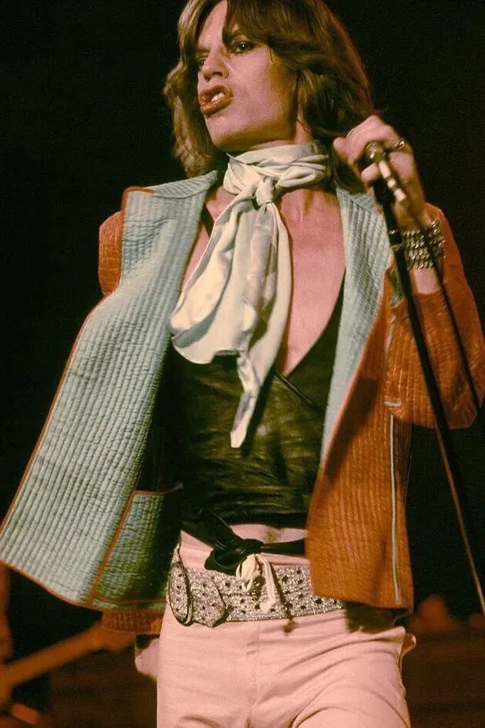 在狂野奔放的70年代,宝爷的英国老乡 —— 传奇摇滚歌手Mick Jagger也是一位风格显著的“骚直男”。