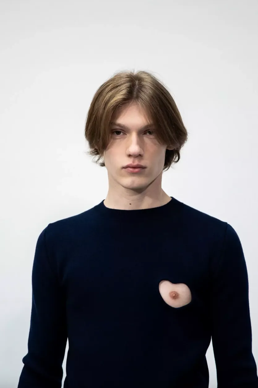 在品牌今年的秋冬系列中,一件被网友调侃为“好男不露二奶”的左胸爱心挖空毛衣顺势走红于互联网,Jonathan巧妙地将先锋理念移植于基础单品之上,相当诙谐。