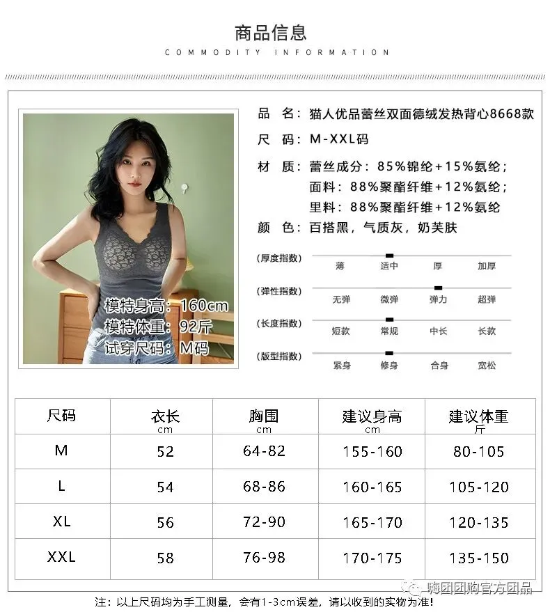 团品:猫人优品蕾丝双面德绒发热背心8668款