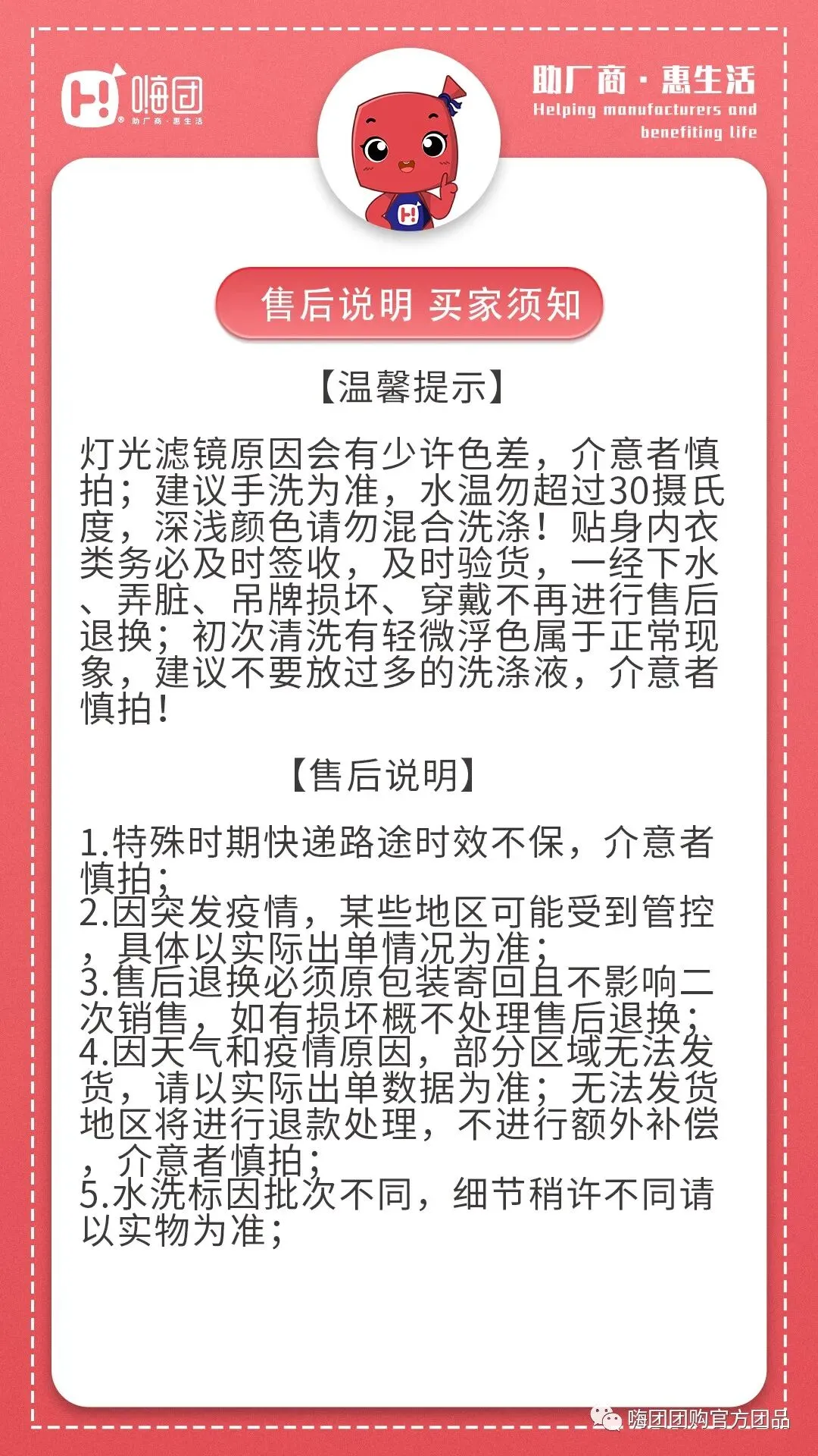 售后:到货有质量问题请在48小时之内带快递面单+产品图片+视频反馈嗨团用户