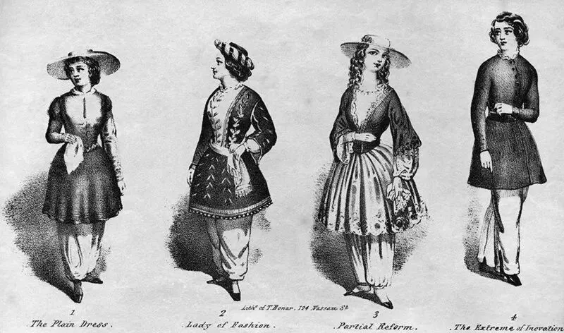 从前,女性只能穿着裙装,裤子是男性的专属。19世纪50年代,女性主义先驱呼吁寻求解放、摆脱父权压迫、摆脱束身衣的束缚。这个话题也在当时走进人们视野。