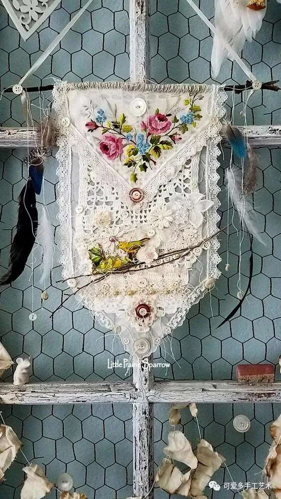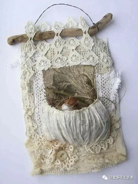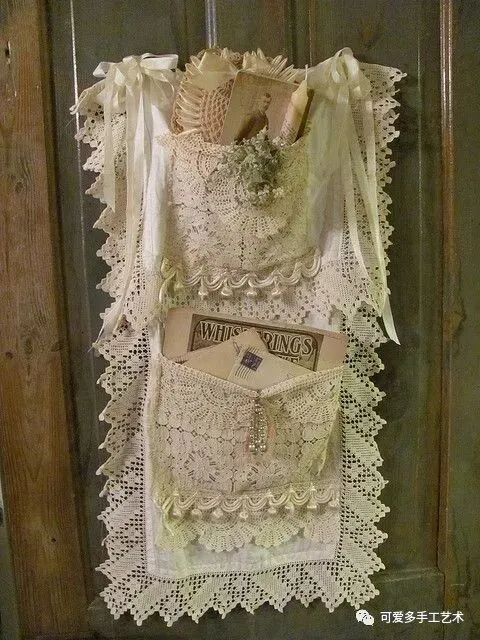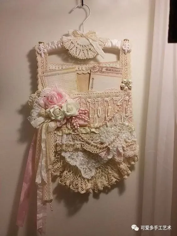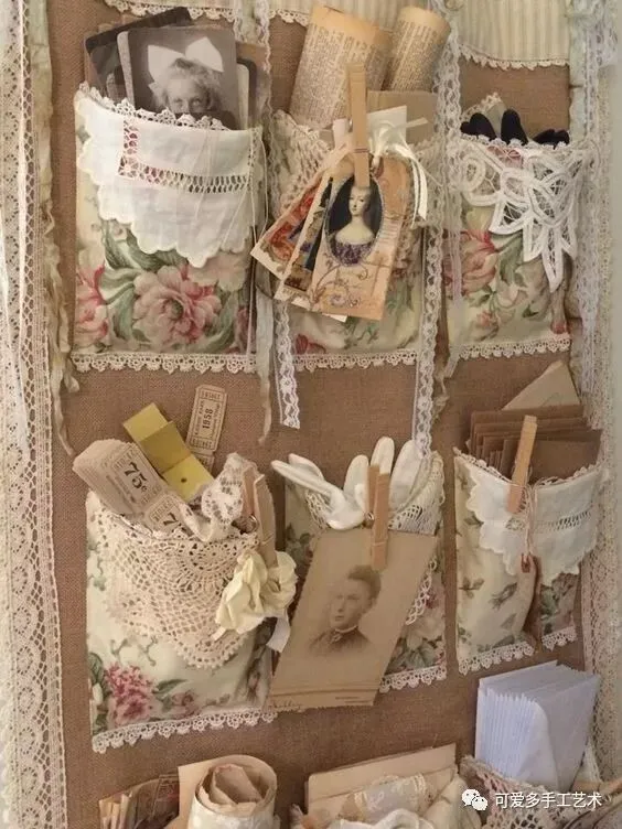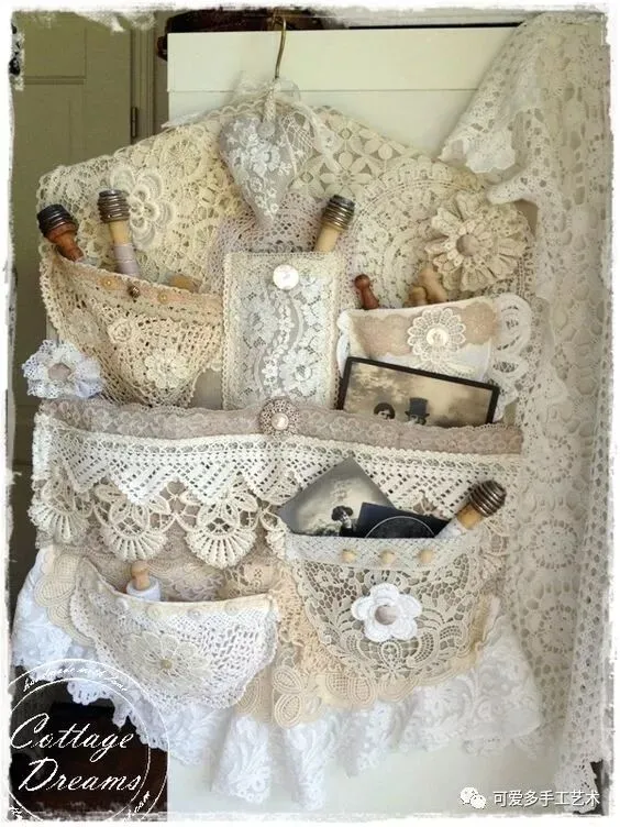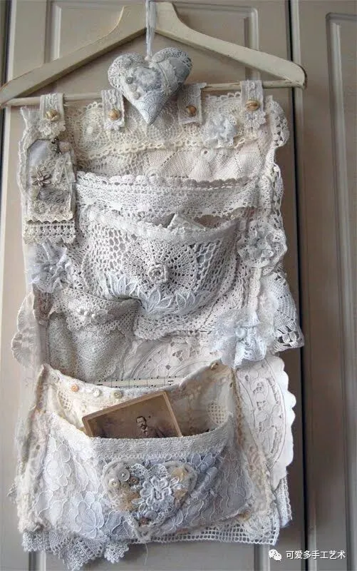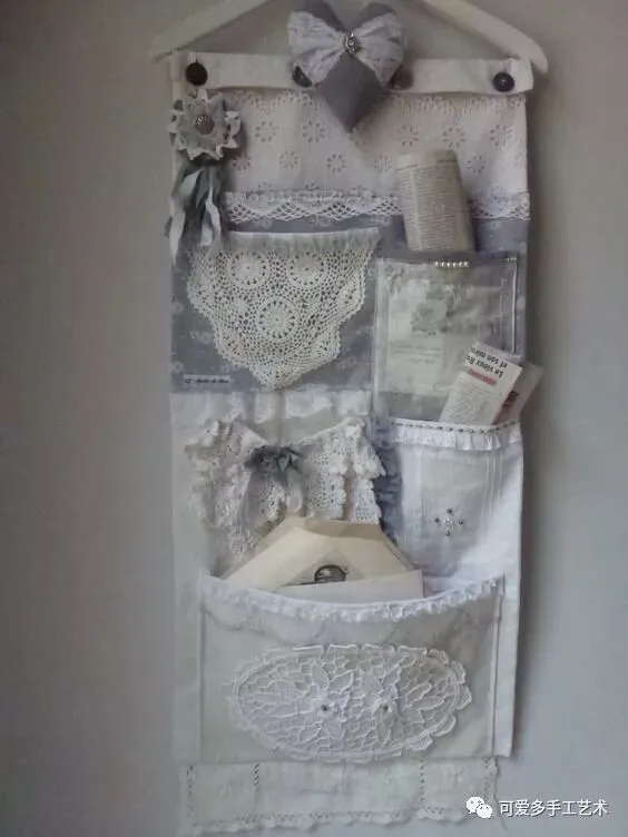 用旧衣服或碎布做成多格的收纳袋,加蕾丝花片或花边缝上去做装饰,再用杆子或衣架挂起来,少女心都要炸裂了。