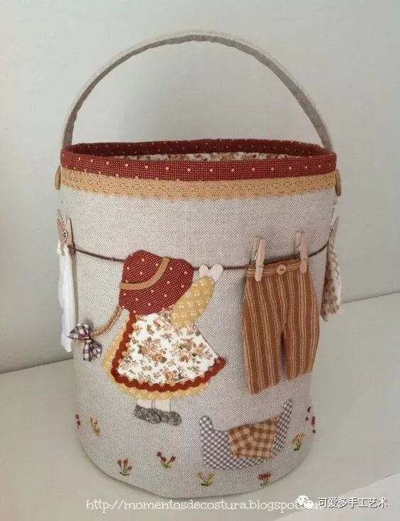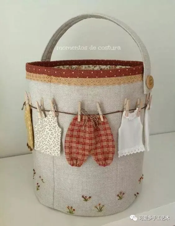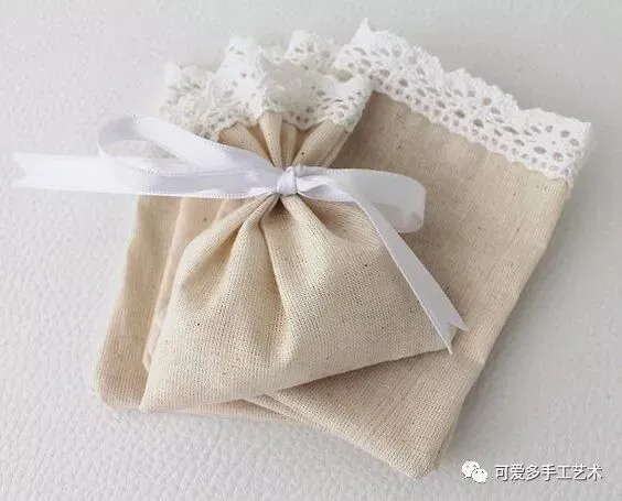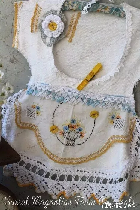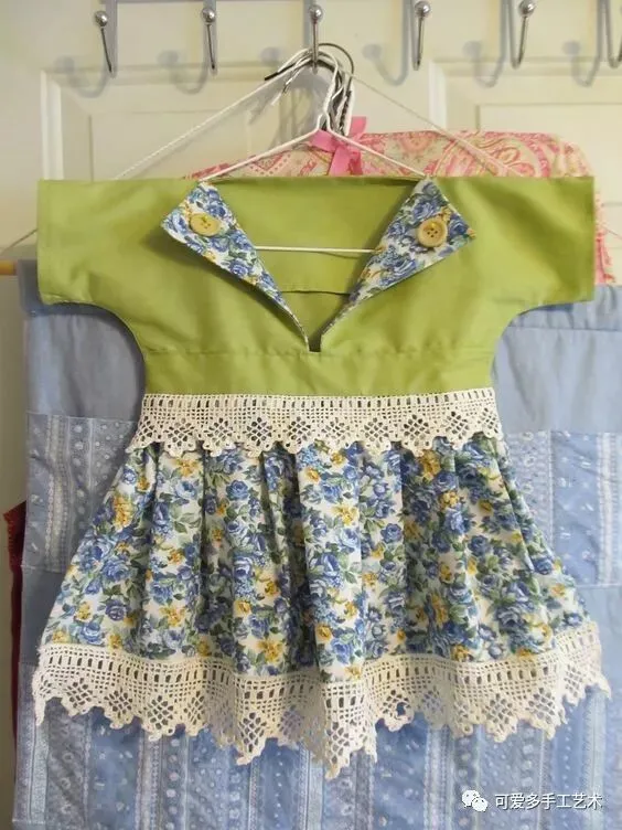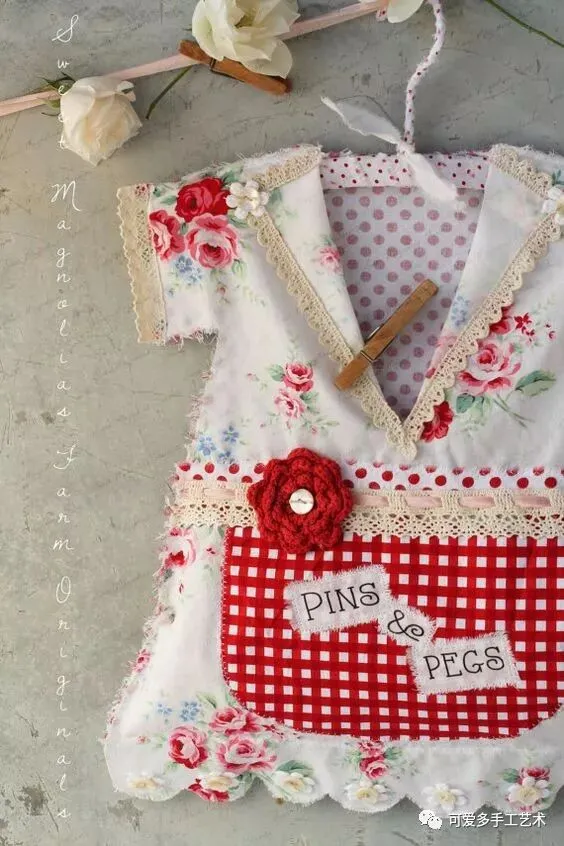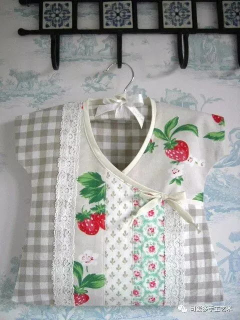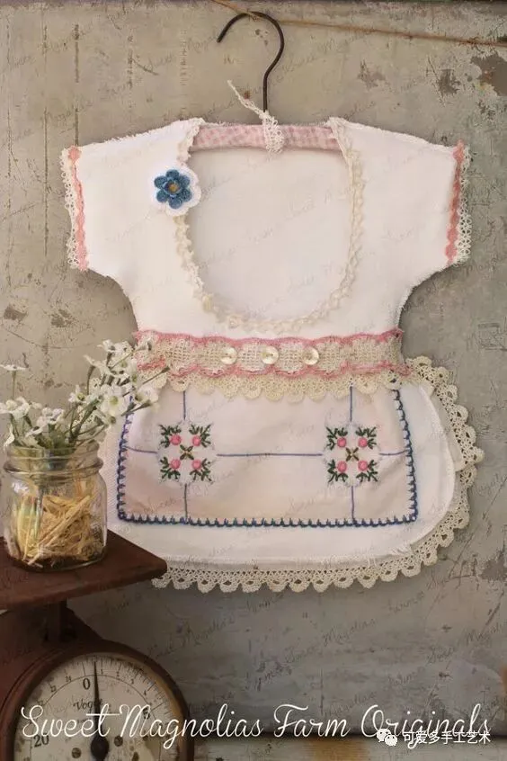 用布剪成衣服的形状,车缝上花边,这样的收纳袋既易做又美观,新手都可尝试一下哦。如果没有旧的蕾丝花片又不会钩花边,可以买现成的花边回家做。