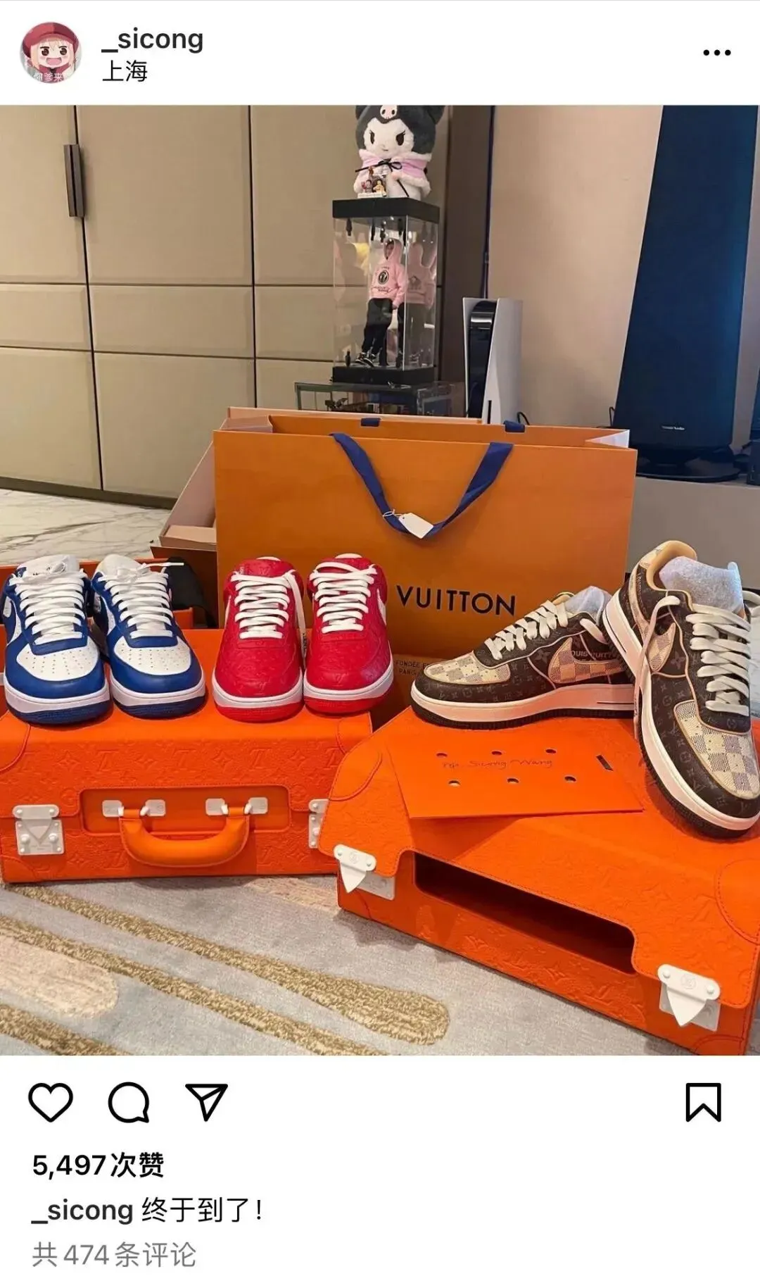 虽然王思聪本身就有LV x 耐克AF1的多版本(市售版、亲友限定版、苏富比拍卖版)。但是他独爱的真是市售这一配色啊!