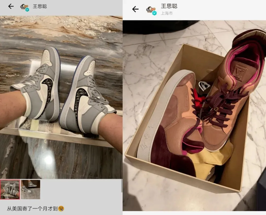 而王思聪上脚的球鞋就看容易辨识了,「LV x AF1」联名,蓝色老花款!