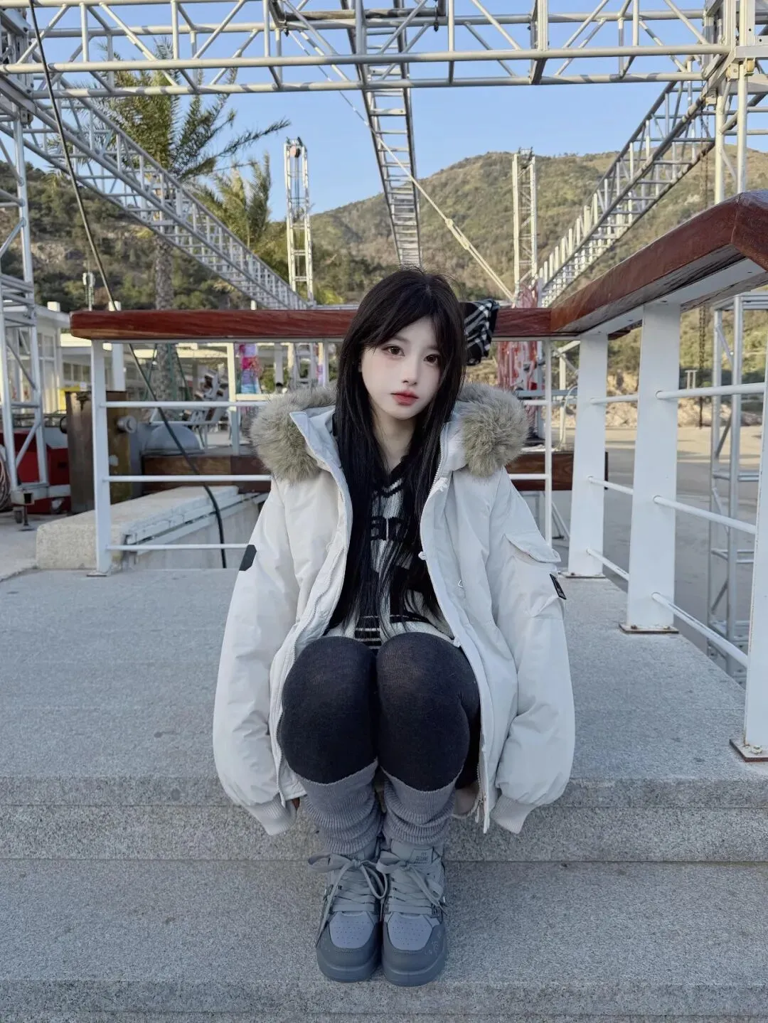 冬天穿棉服最怕“臃肿得像熊”,但这套选的米白色宽松款棉服,直接把“显胖bug”变成了“氛围buff”: