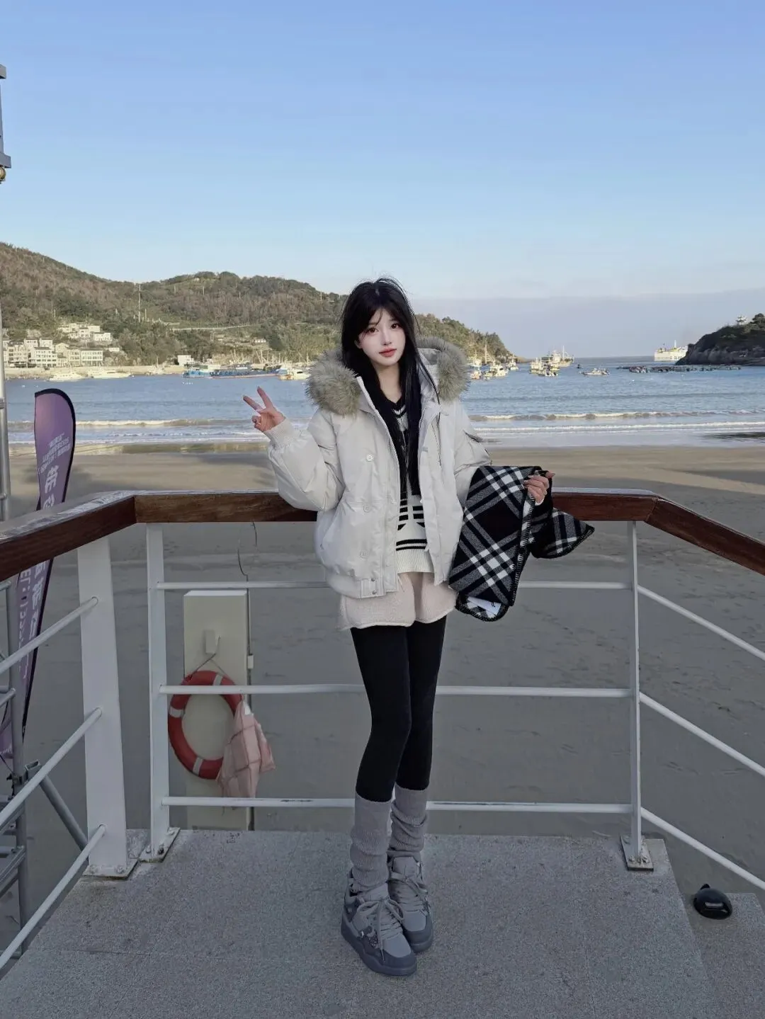 上周刷到一组海边随拍,直接把我焊在屏幕前——米白棉服裹着纤细的腰线,黑丝绒裤腿衬得脚踝超细,蓝天碧海当背景板,松弛感和少女感同时在线,关键是肉眼可见的“暖乎乎”!