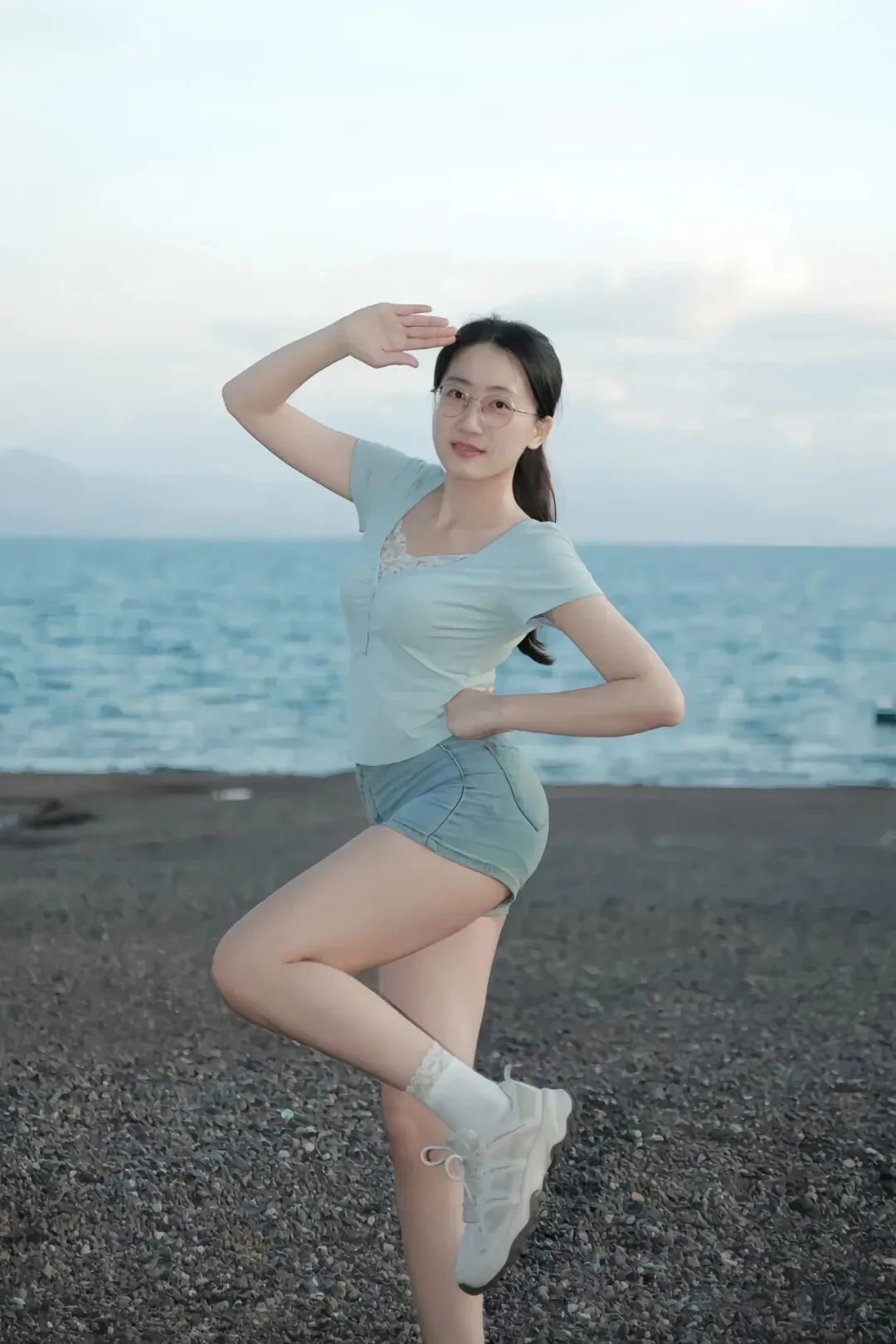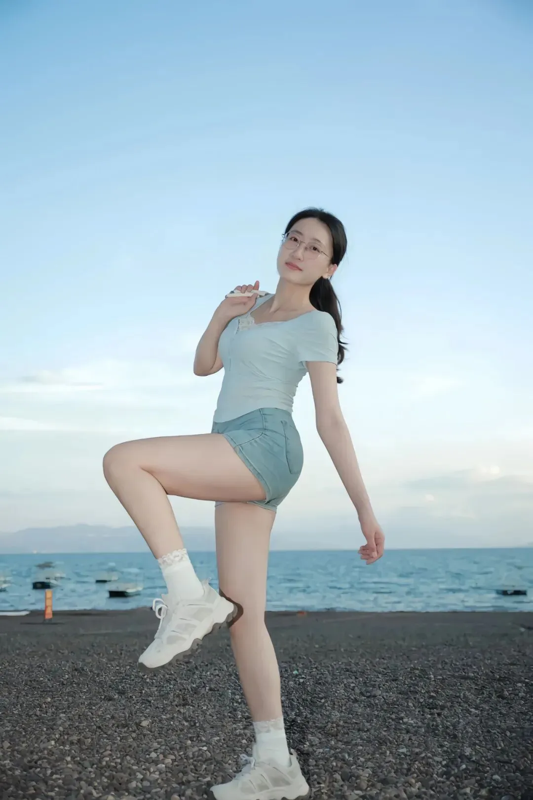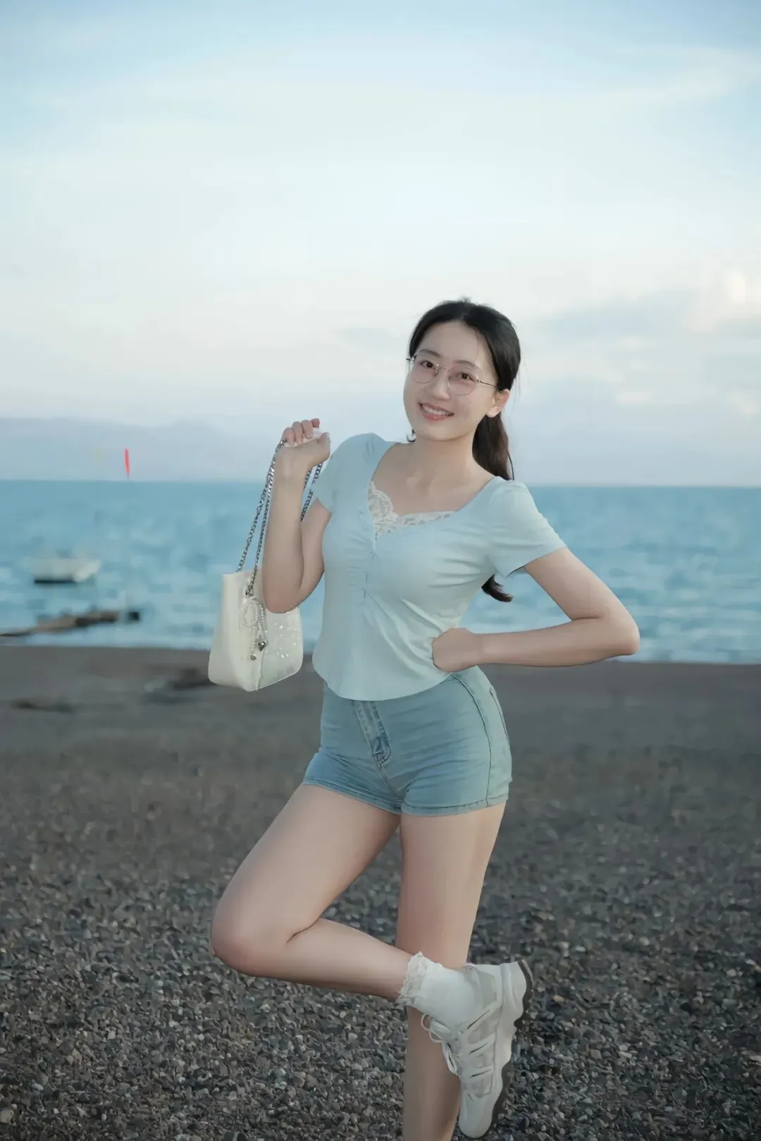 浅蓝蕾丝V领短袖搭配牛仔短裤,清新色系与海天背景自然相融,蕾丝柔美细节中和牛仔利落,短裤剪裁修饰腿部线条,保留随性活力感。站在近水砾石滩,身体侧向镜头约45°,单腿自然屈膝,脚尖轻盈点地,另一腿稳立,一手提着白色链条包,手臂自然弯曲,指尖轻握包链,另一手轻搭腰间,肩颈舒展下沉。面带笑意直视镜头,神态自信亲和,与背景碧海远山、远处浮船形成悠然互动。镜头略高于人物视角,规避地面杂乱,凸显从肩颈到腿部的流畅线条,蕾丝袜边与白色运动鞋搭配,为整体造型增添精致与休闲感。