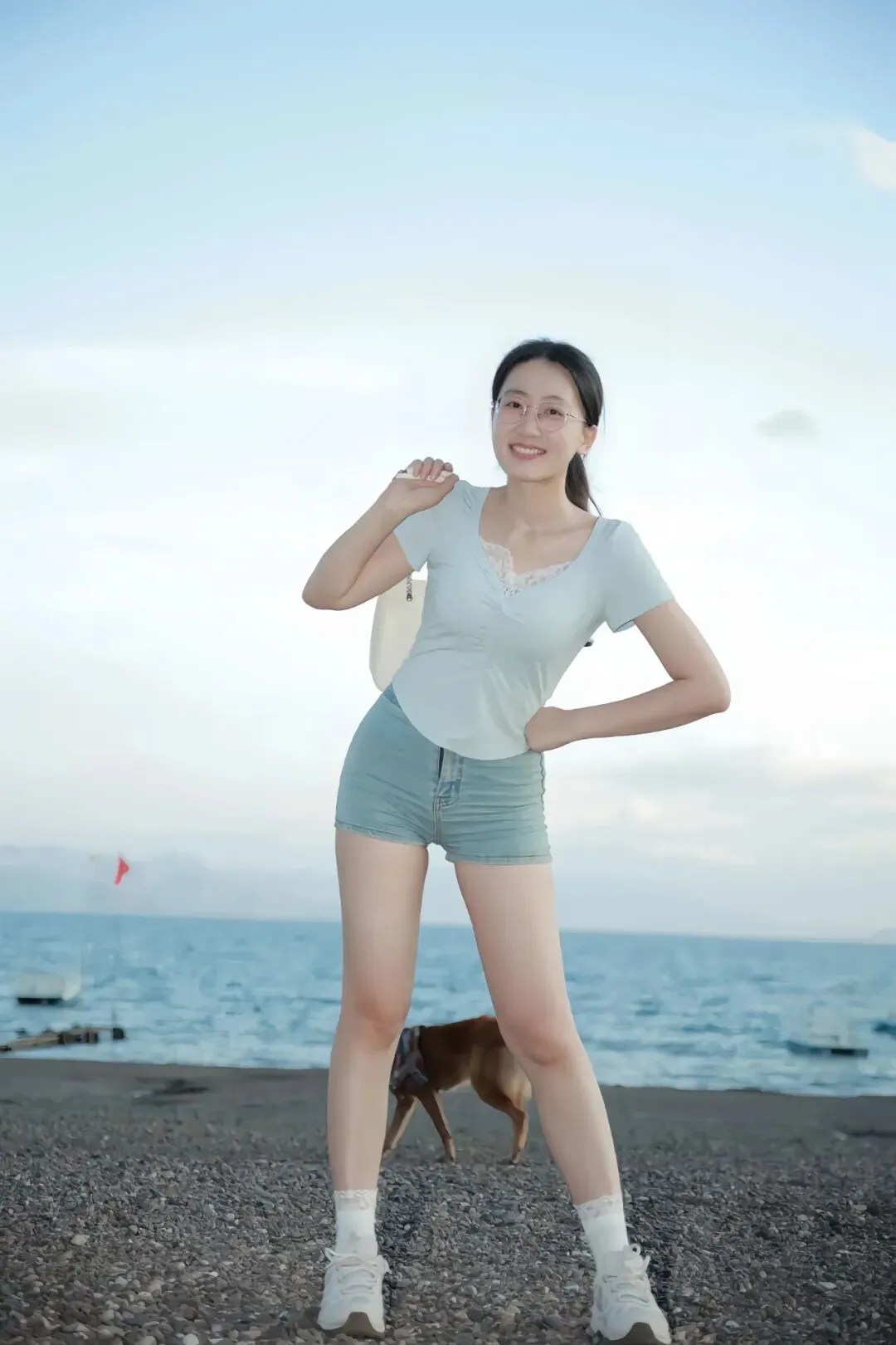 浅蓝蕾丝V领短袖搭配牛仔短裤,清新色系与海天背景相融,蕾丝细节柔化硬朗感,牛仔短裤利落剪裁修饰腿部线条,保留休闲松弛感。站在近水砾石滩,身体正对镜头,双腿自然分开站稳,一手叉腰,指尖放松不紧绷,另一手轻搭肩头,肩颈舒展打开,面带笑意直视镜头,神态自信活泼。背景碧海远山与穿行小狗形成生动互动,让整体氛围更显轻快。镜头略高于人物视角,规避地面杂乱,凸显从肩颈到腿部的流畅线条,蕾丝袜边细节为造型增添精致感。