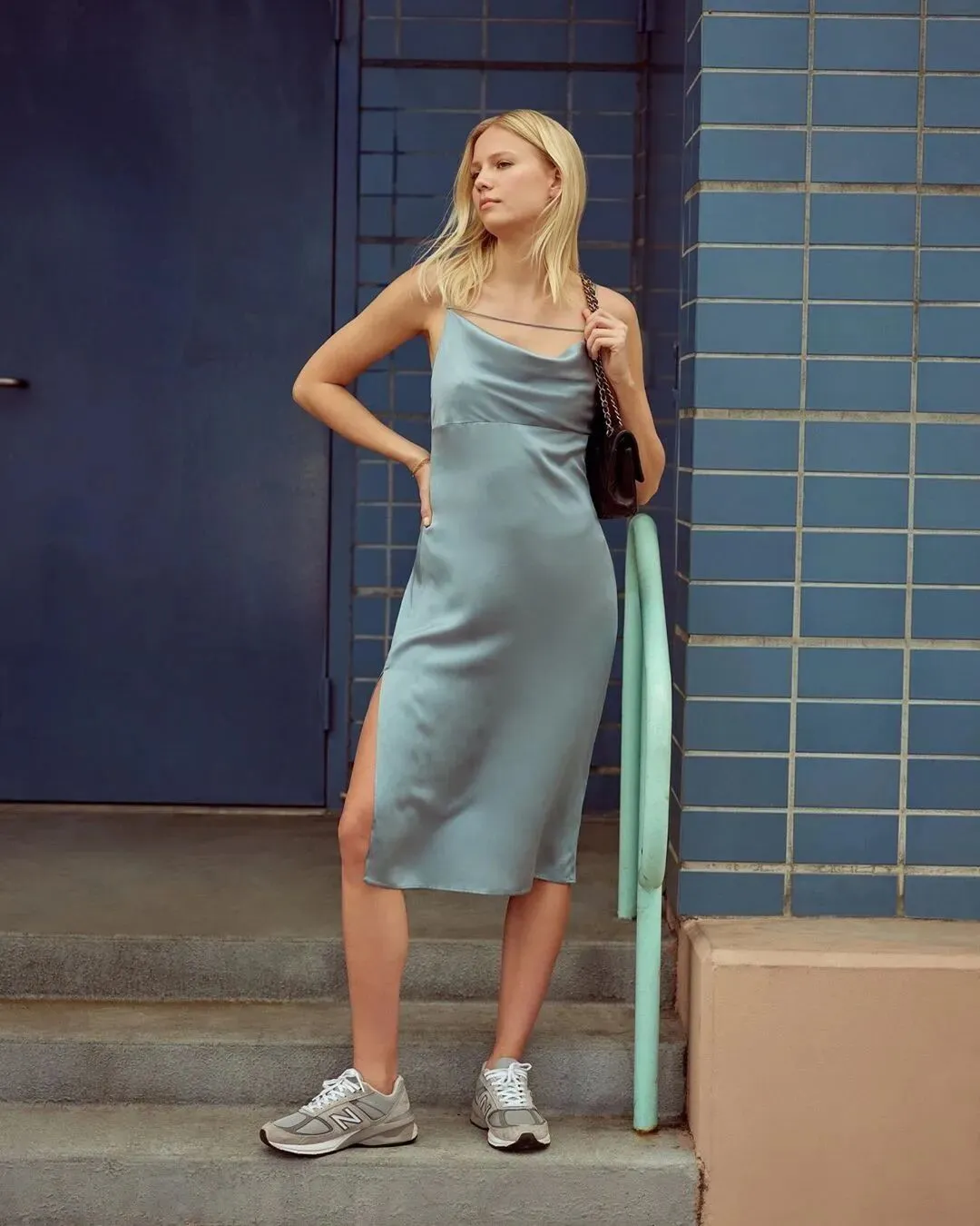 对于缎面吊带裙而言,色彩的饱和度高低根据自己的肤色进行选择就好,黑白双色百搭且不容易出错,而一些更明快的色彩或是图案也很合适活力满满的夏日。