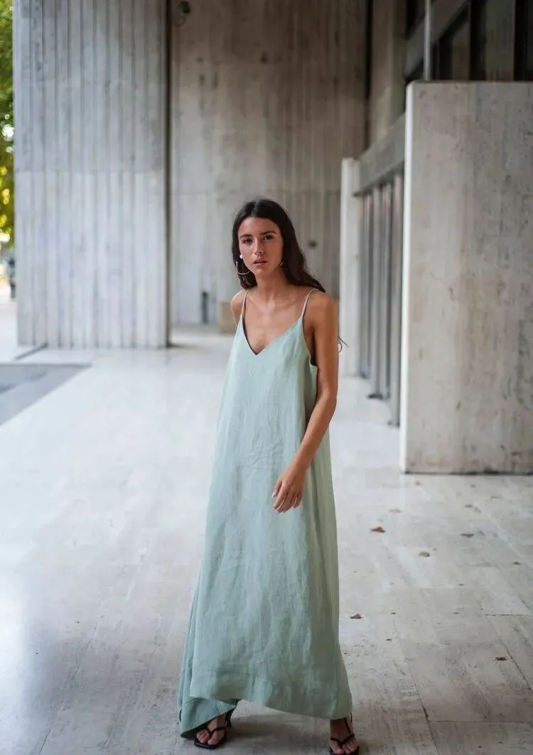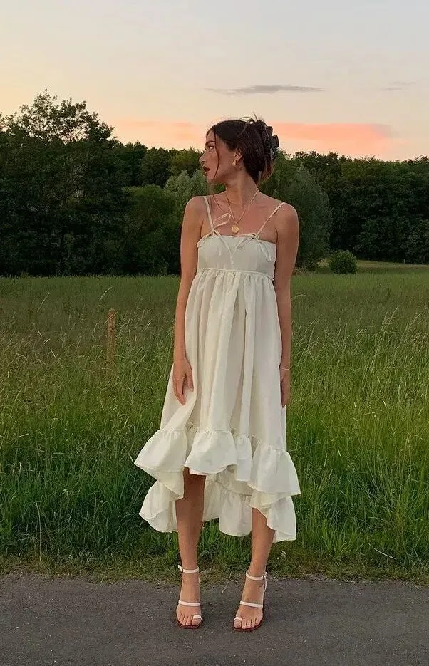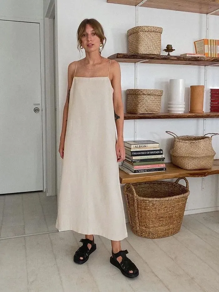 果觉得缎面太过于贴身,那充满着自然气息感的棉麻材质也和轻盈的夏日适配度很高,纯净的白色也在优雅之余加上了几分随性感。