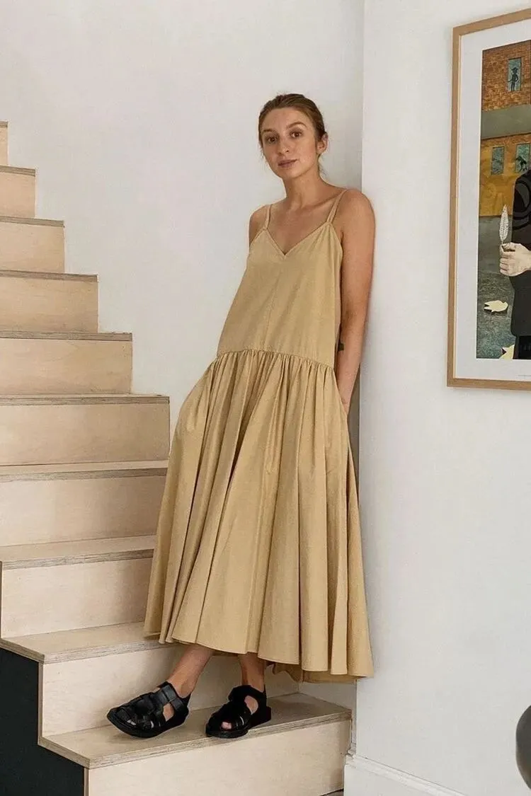 同时也可以放弃收腰的廓形,让整体裙摆呈现简约的H型,脚踩一双凉鞋就能带入一种怡然自得的森系氛围,简约且不单调。