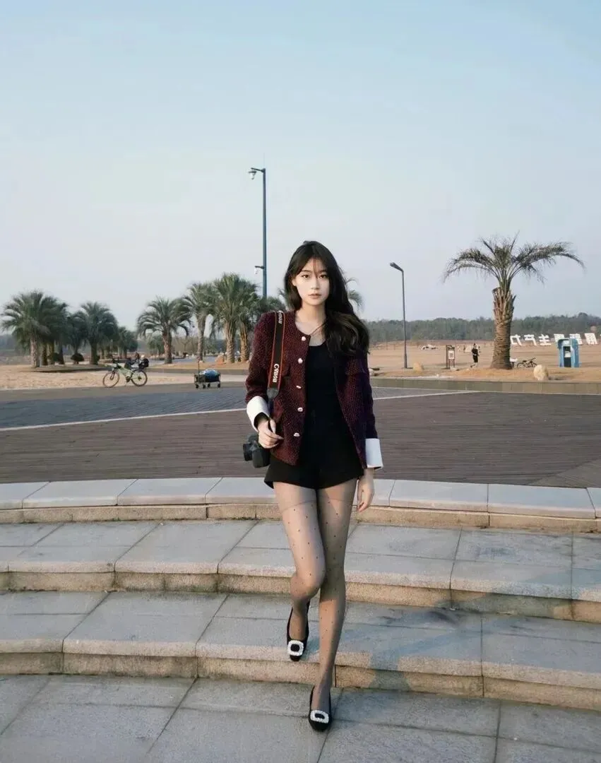 远远.看过去,.最吸引人的.就是那件.酒红.色的粗花.呢外套。海.风轻轻吹.过,.衣角微微扬.起,带.着一种随性.的优雅.。她里.面穿.了一件简.单的黑色.吊带,下.面配了一条.黑色短裤,.整个人.看起来利落.又精神。.最妙的是.那双波点丝.袜,给一.身沉稳.的配.色加了点.俏皮的.味道。脚上.的黑色小皮.鞋,带.点跟,悄悄.拉长了.腿型。