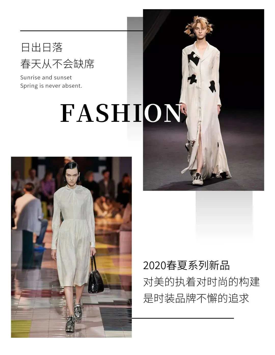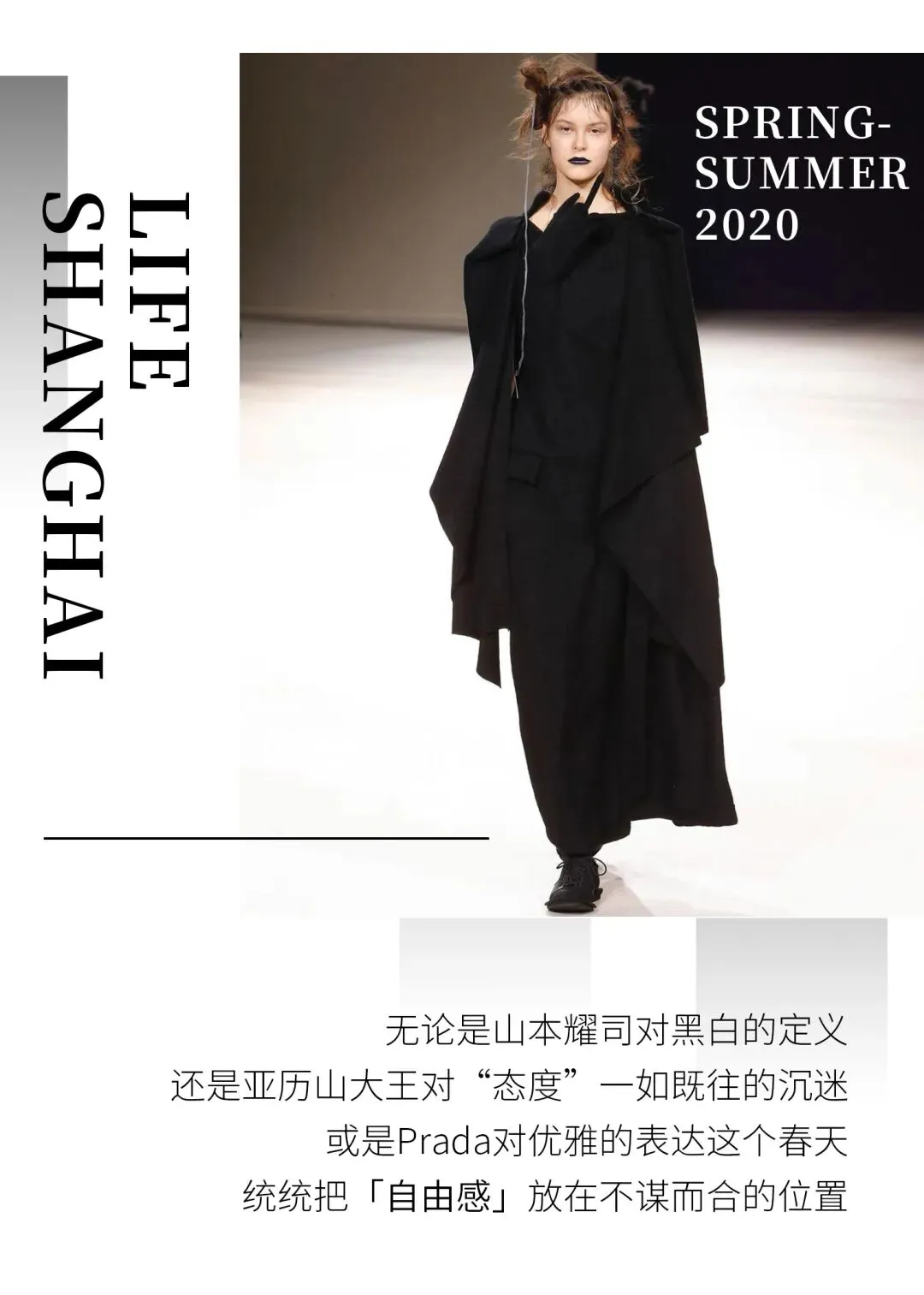黑白配饰、垂坠感的长袍、舒适无负担的穿着搭配方式,在2020年将会在更多年轻人的生活里被推崇。随身体摆动出生命感的服装曲线,不分国籍、不分性别,让世界都爱上诗意黑白。