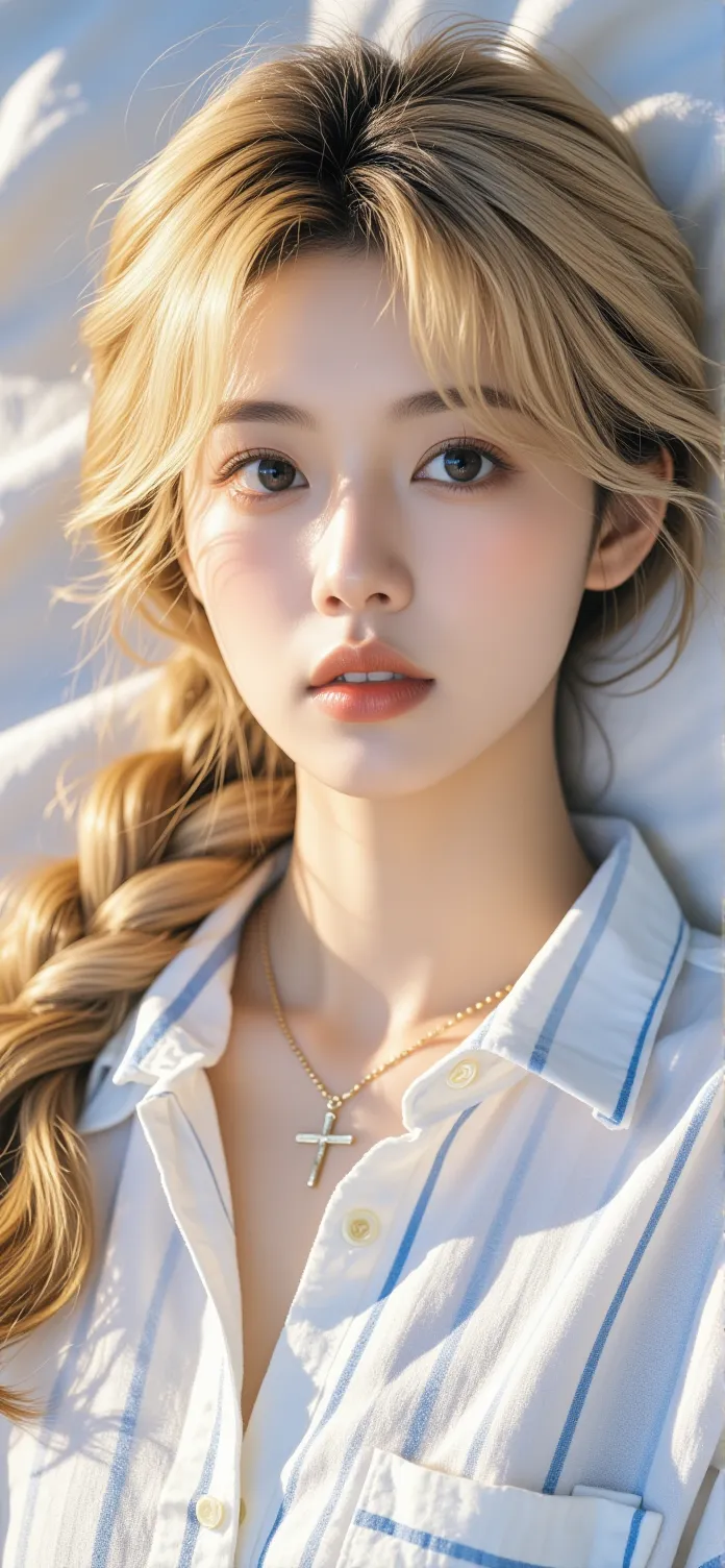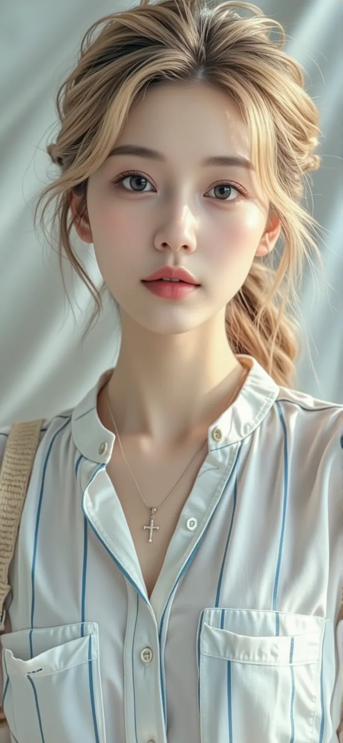 说实话,那天去海边本不是为了拍照。天空是那种厚厚的、水粉调不开的灰白,海面安静得有些严肃,远处货轮像用铅笔淡淡划在纸上的线。我套了件最普通的白色长袖棉衫,料子洗得太多次,软塌塌地挂在身上,领口已经没了筋骨。下面配了条灰色紧身短裙,从衣柜里拽出来时还带着樟木丸的涩味。我站在堤岸上,海风比想象中蛮横,一股脑地灌进袖口、领口,把衣服向后绷紧,布料瞬间成了另一层皮肤,诚实地裹出从肩胛到腰窝每一寸起伏。我下意识双手叉腰,这个动作让上衣下摆缩上去一截,后腰那段肌肤猝不及防地撞进冰凉的空气里,也撞进身后朋友举着的手机镜头中。从她倒转的屏幕里,我看见一个陌生的自己:长发被风揉乱,白衣灰裙,站在无尽灰蓝的背景前,像一个突然闯入静谧油画里的、生动的标点。