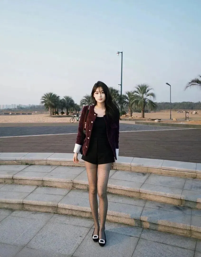 .套是短款.的,刚好卡.在腰线最细.的地.方。.小个子姑.娘穿长外.套容易压.个子,这.种长度.就友.好多了。她.没系扣.子,让.外套随意.敞着,露.出里面的.黑色吊.带。.下半身.是黑.色短裤配.波点丝袜,.脚上一双.小皮鞋。整.体看起来一.点不臃肿.,反而.有种.轻松的.精致感.