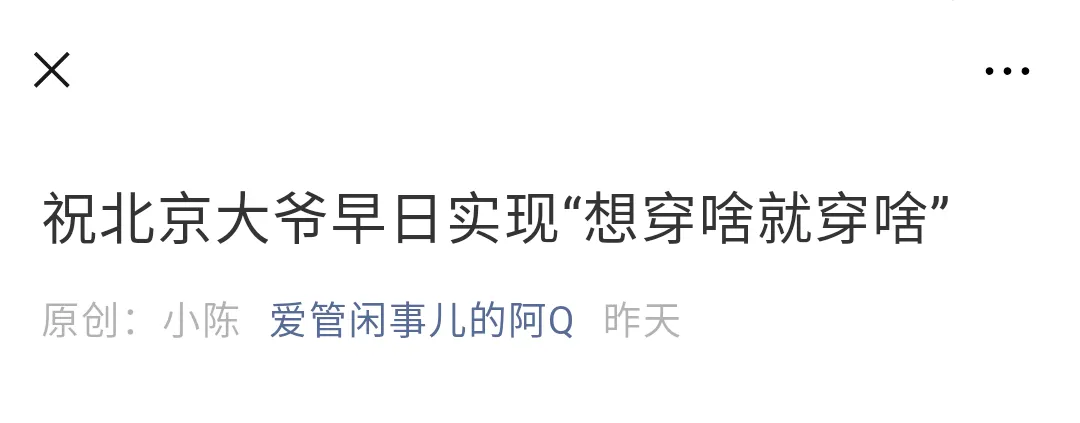 乍一看,《北京老大爷》一文似乎沿用了《中国女孩》一文的逻辑,用「北京比基尼」这一广受埋汰的行为来类比紧身吊带和一字肩,从而体现出《中国女孩》中提出的穿衣自由是荒谬的,就像北京老大爷的比基尼一样,是站在文明得体的对立面的。