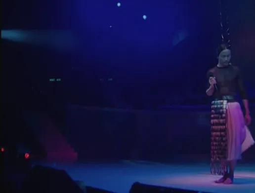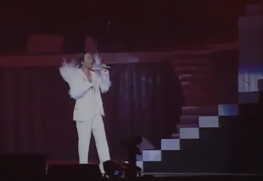 演唱会上,长发的张国荣穿着裙子、羽毛外衣、亮片紧身衣完成了一场堪称完美的表演。