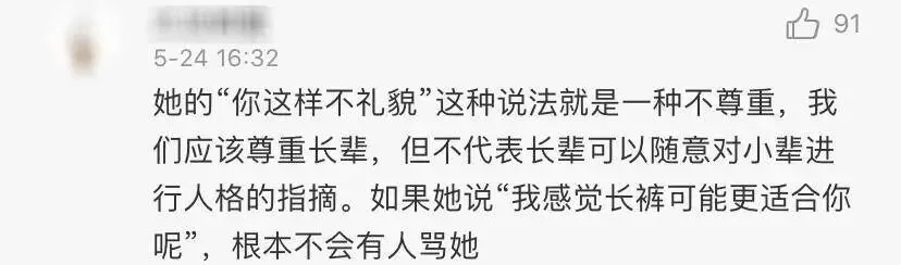 且不说陈若仪的裤子根本和短沾不上关系,就算女孩子穿条短裤,也不至于被批评不礼貌。