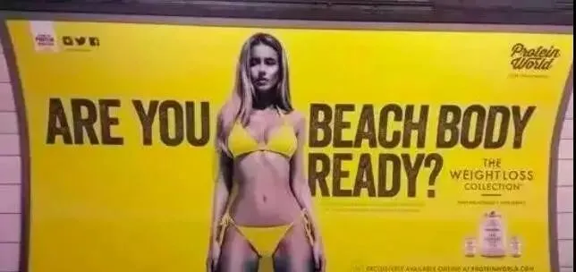 比如,此前英国的一个蛋白粉广告海报和标语引起了各界女性的讨伐声。