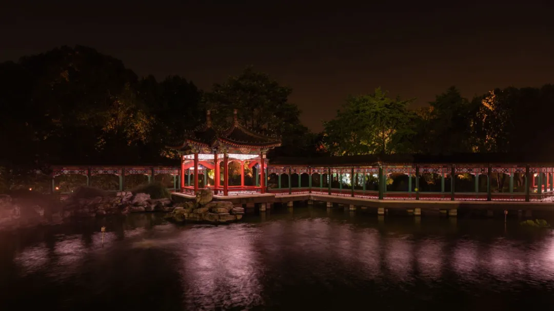 After Party 则在王府庭院及园林中举行,投射温馨柔和的粉色灯光,与府邸庭院池塘中的倒影相映成趣。