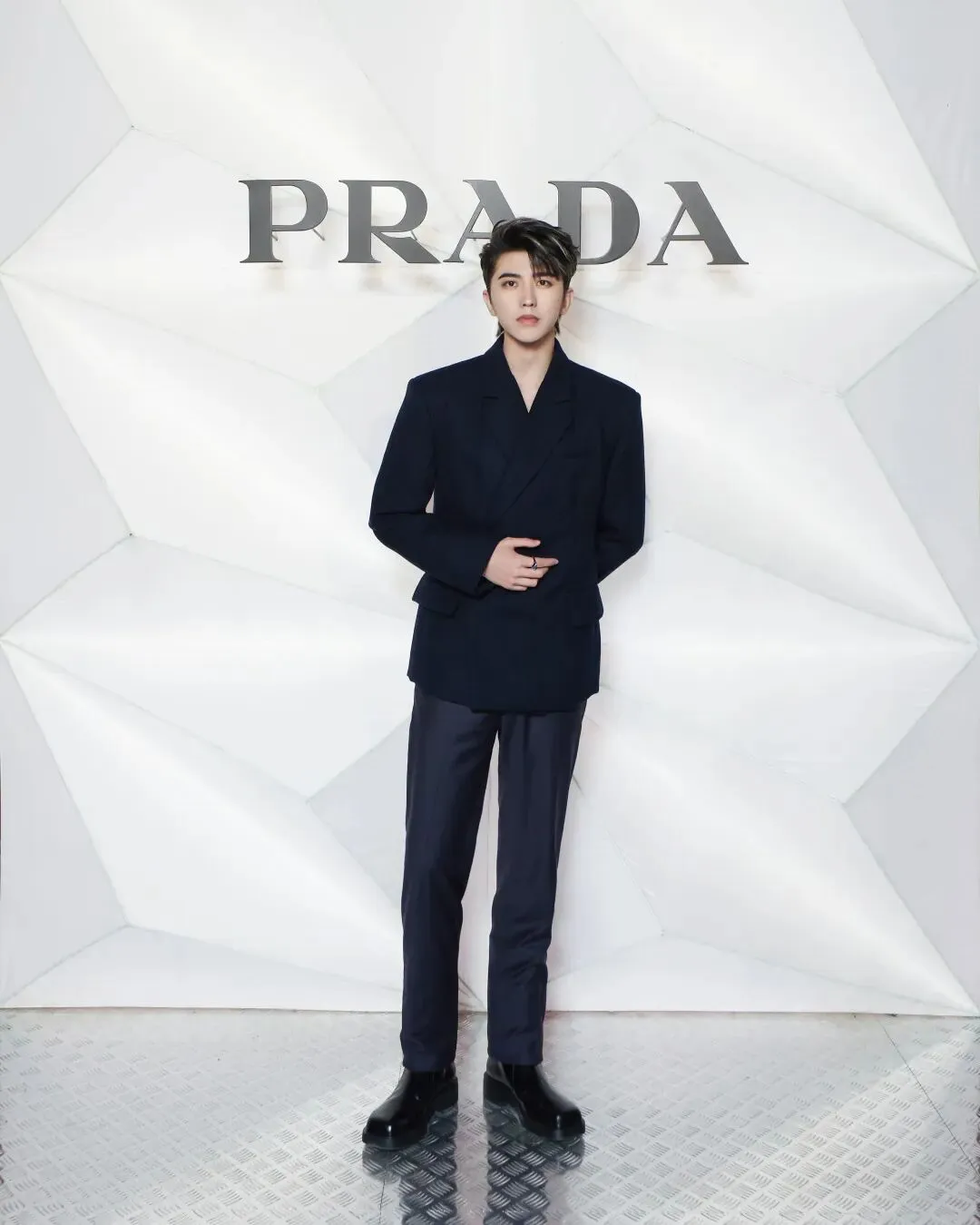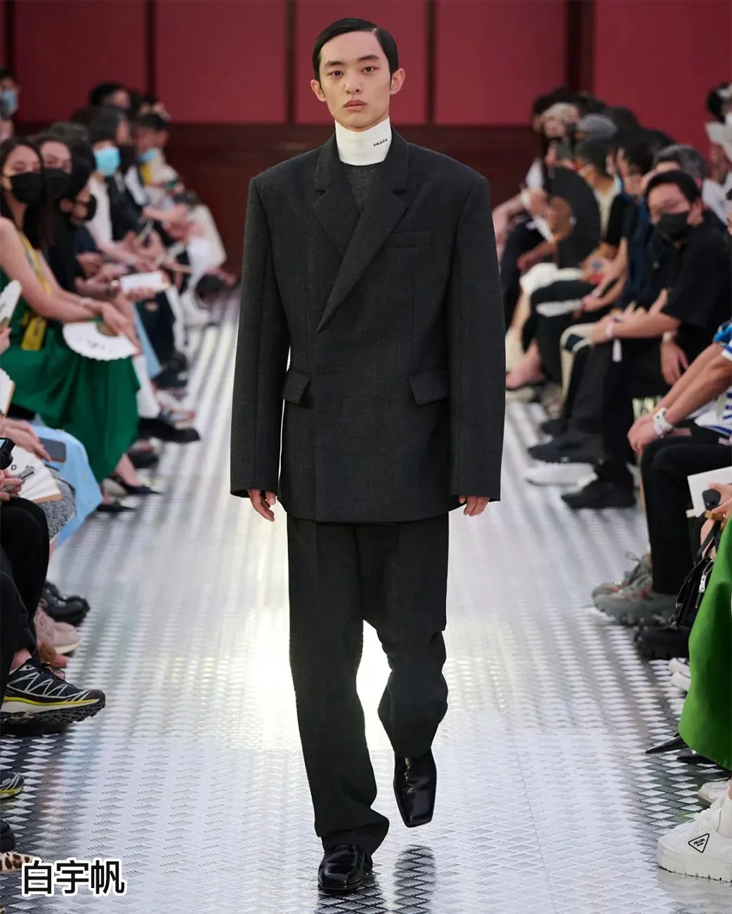 品牌代言人蔡徐坤身着 Prada 2022 秋冬系列套装出席。