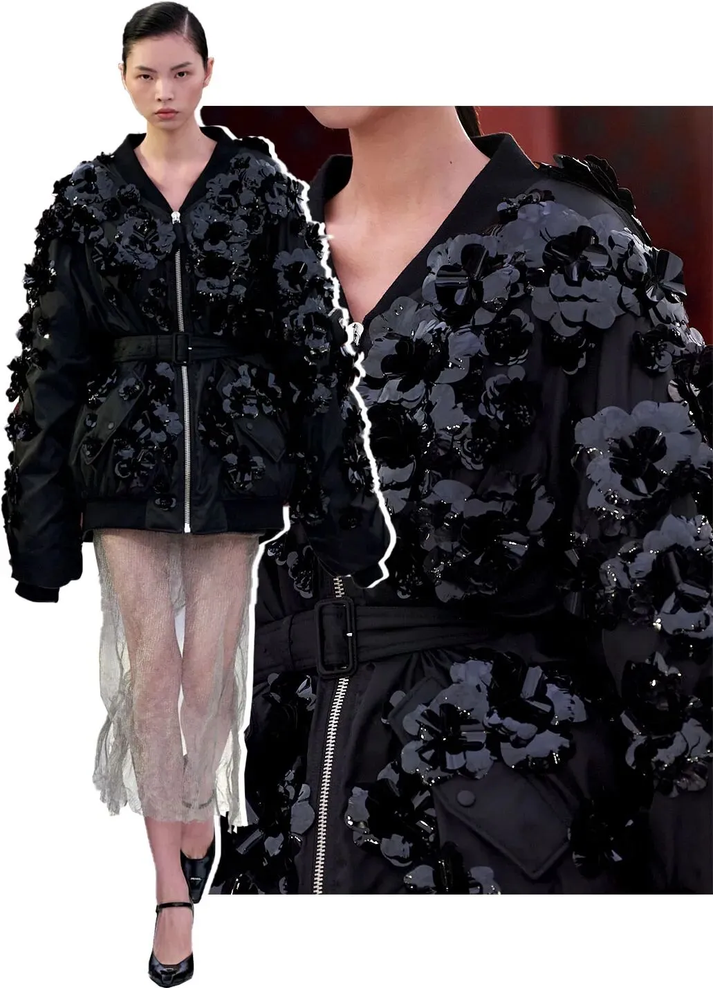 将传统印象中只属于礼服的刺绣、亮片元素,平行移到日常的夹克之上,特立独行的材质与简约廓形相结合,完美体现了 Prada 的本质。