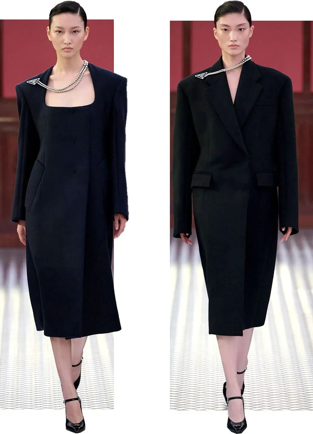 线条利落的鸡尾酒裙与大衣,强轮廓感的肩线上,装饰了常见于军旅铭牌上的粗犷链条,与 Prada 经典三角徽标交相辉映,去性别主义的意图十分明显。
