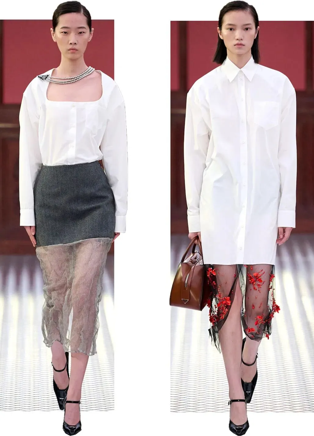 当然也少不了白色衬衫单品,方领或立领的设计都秉承着简约至上的原则,但下身搭配的薄纱却多了一丝魅惑与风情。
