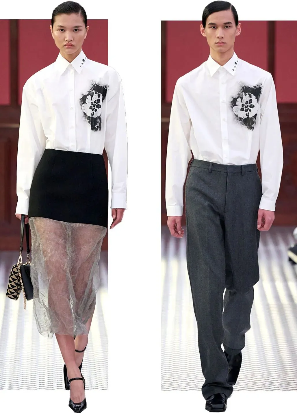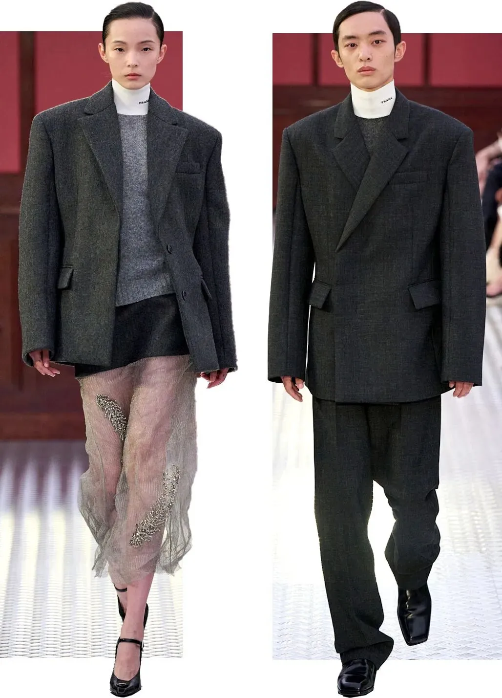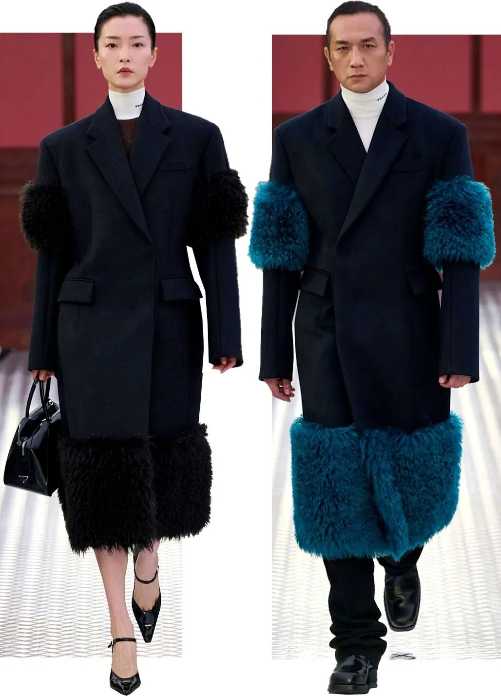 这场大秀由联合创意总监 Miuccia Prada 和 Raf Simons 联合创作,首度进行男装女装同台形式的亮相。