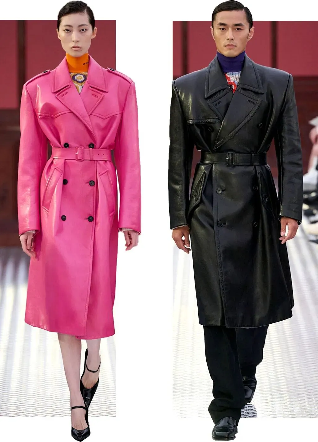 传统视角中极具硬汉意义的皮质风衣,轮廓感十足的廓形和剪裁都足够硬朗,换上明艳粉色后,女生上身也毫不违和,反而更具力量感。