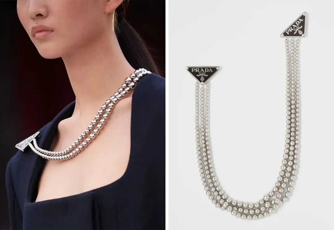 秀场上吸引不少人的链条其实是一条项链,可以百搭于各种风格的领口,也能当做胸针使用。