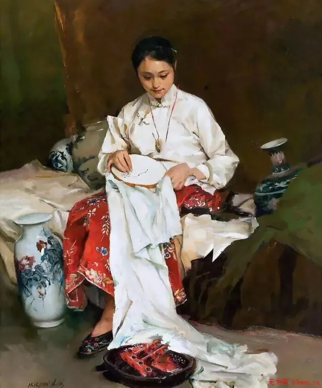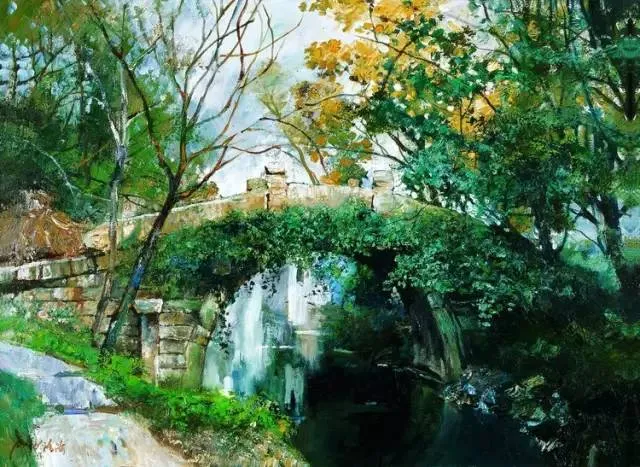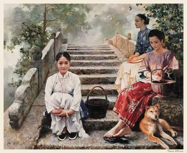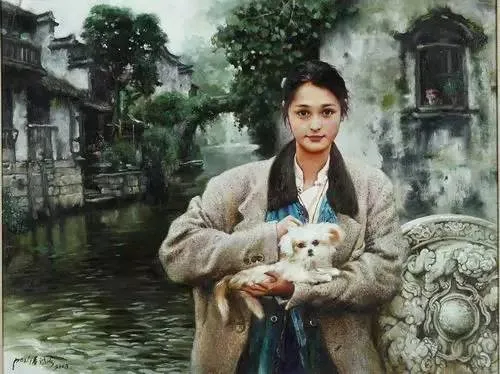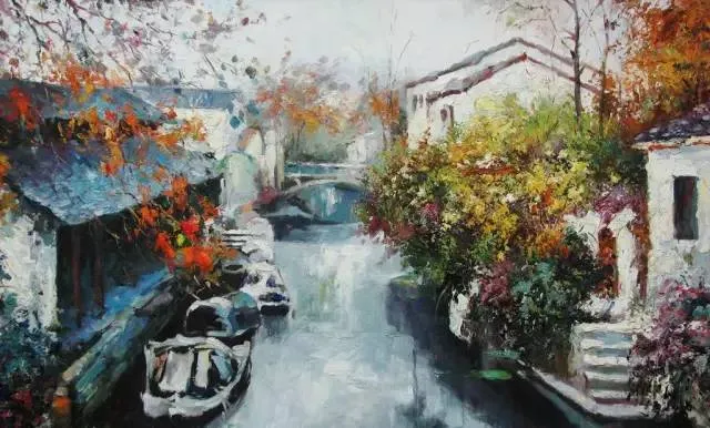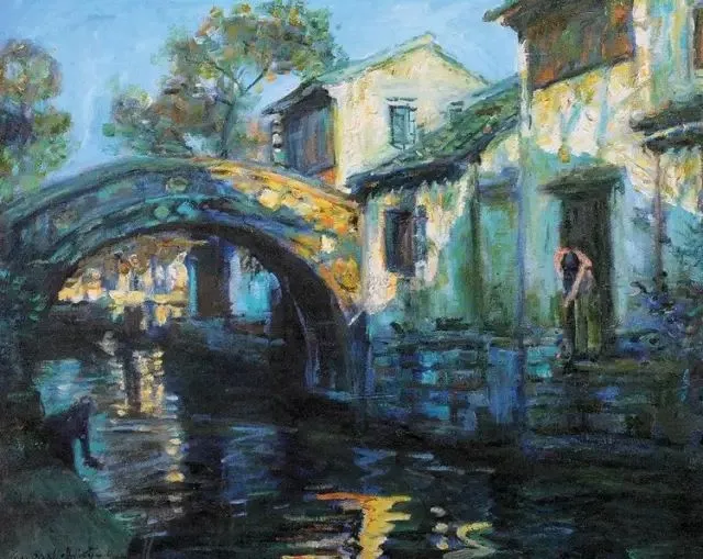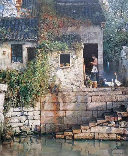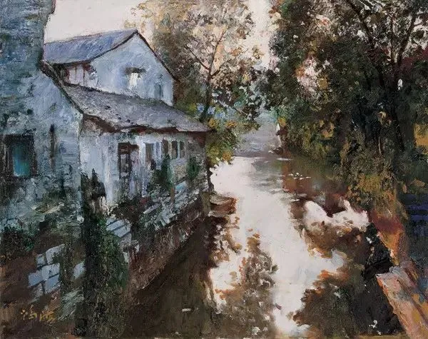 潘鸿海的作品里,悠悠小河、深深庭院、温婉的少女、宁静的石桥……共同构成了他江南水乡的符号,这些形象一直是潘鸿海水乡油画不变的主题。