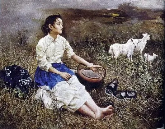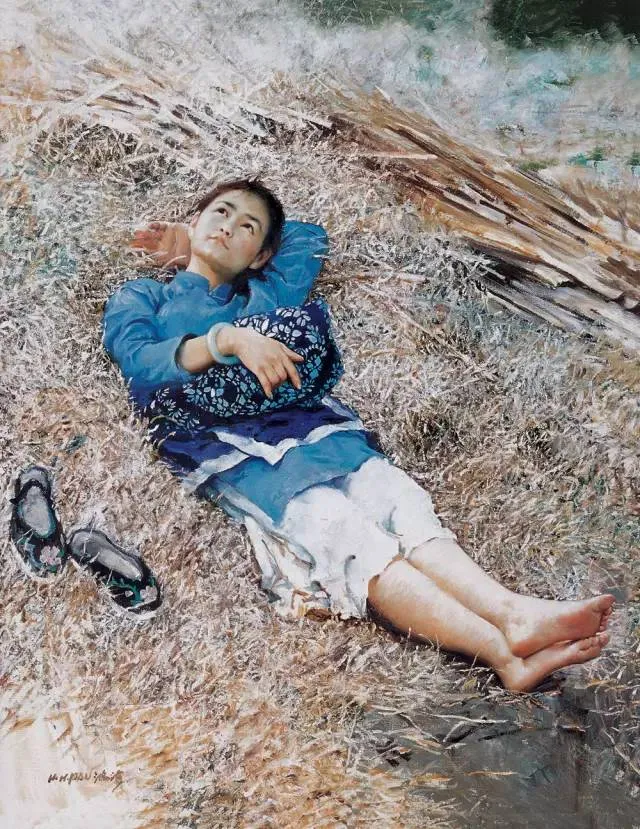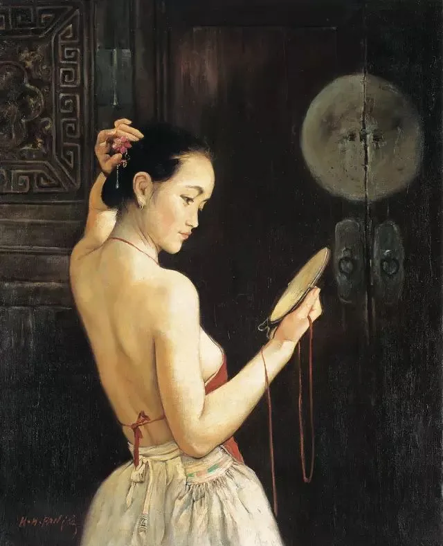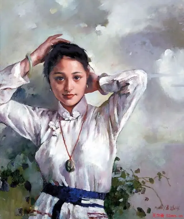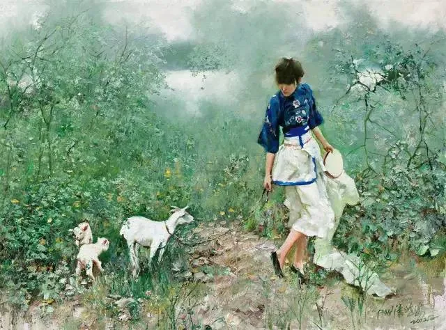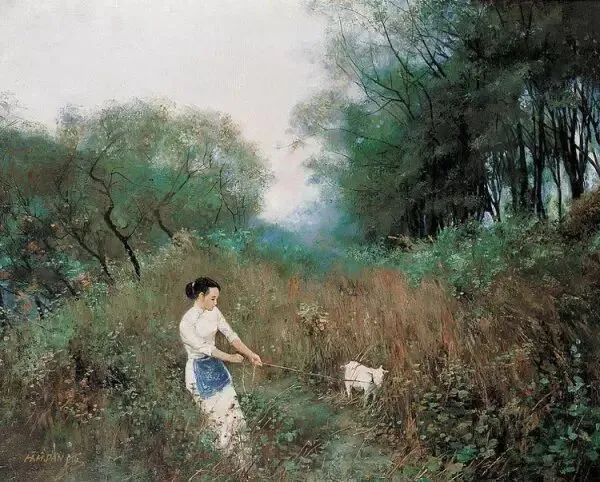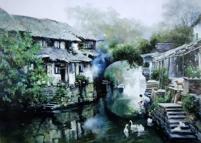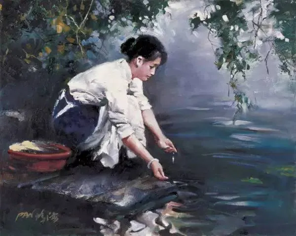以小见大、以近及远,林中的一角屋檐、河面上的一艘乌篷船、河边一个俏丽的洗衣女子的身影,诗情在画笔下自然流淌。清新的色彩语言是潘鸿海水乡画的另一特点。在色彩的运用上,他偏爱冷色调。他常常用冷色表现女性温柔的肤色,如凝脂,如晨曦。