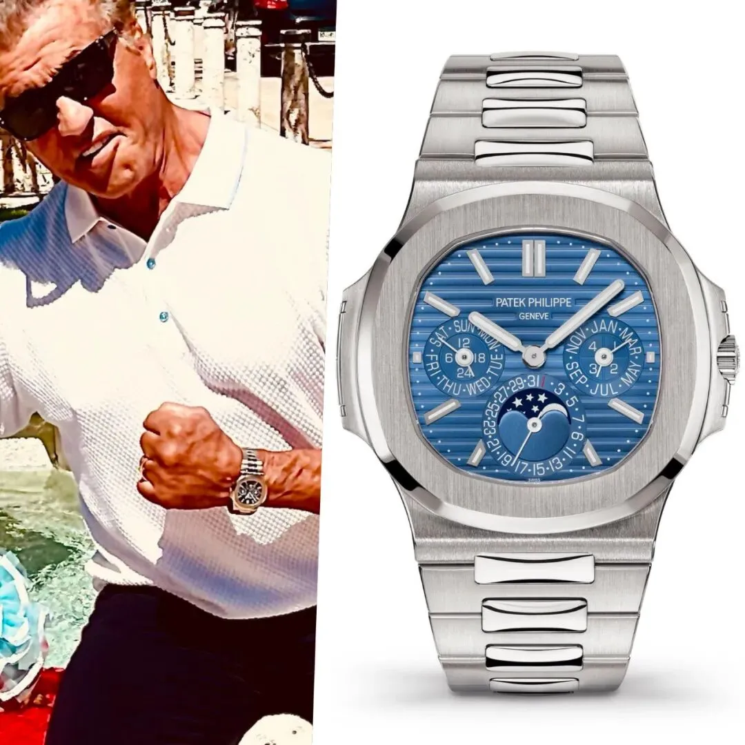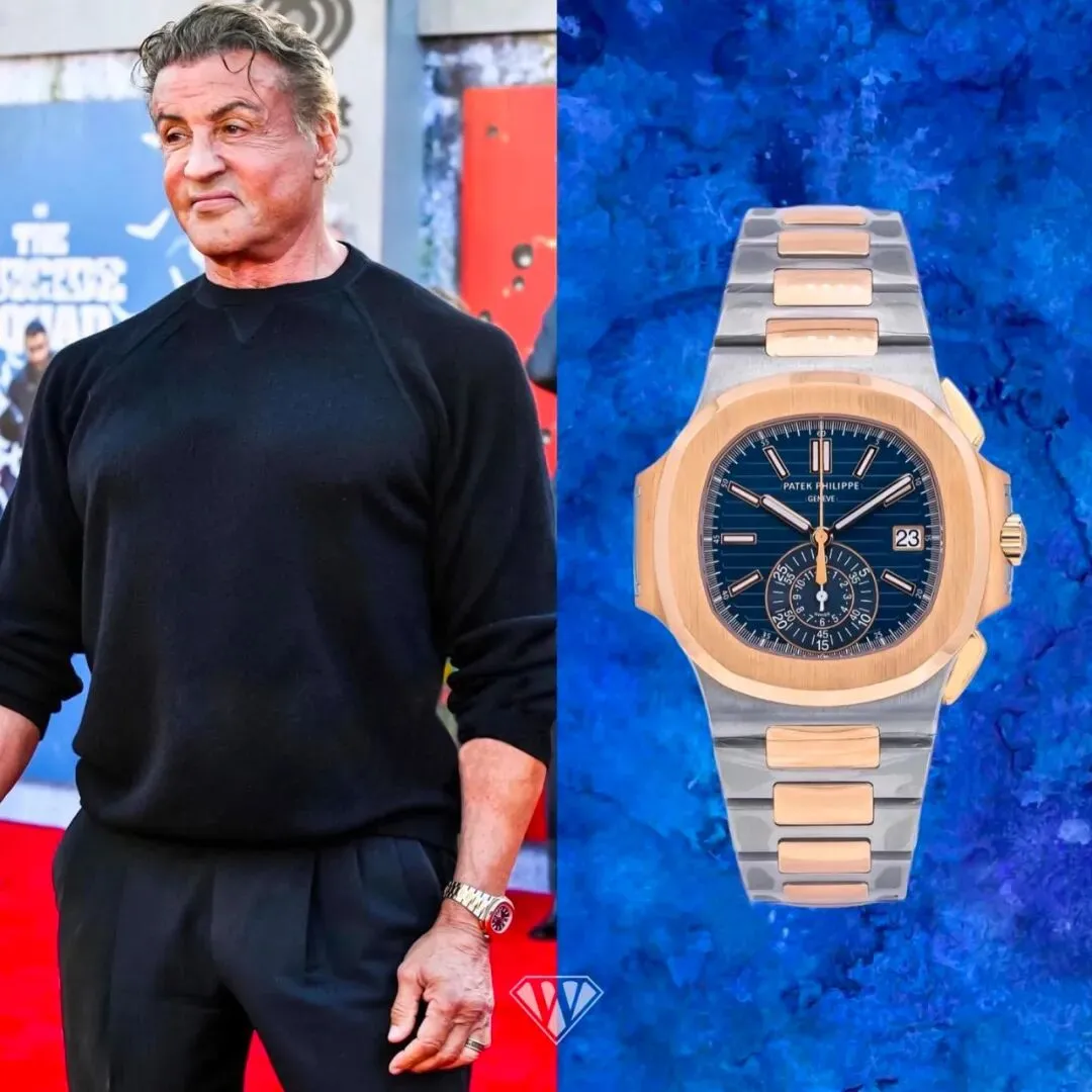 另外,富豪喜欢的百达翡丽鹦鹉螺,史泰龙同样喜欢。他有一枚18k玫瑰金&不锈钢款的计时码表,还是蓝色渐变表盘。