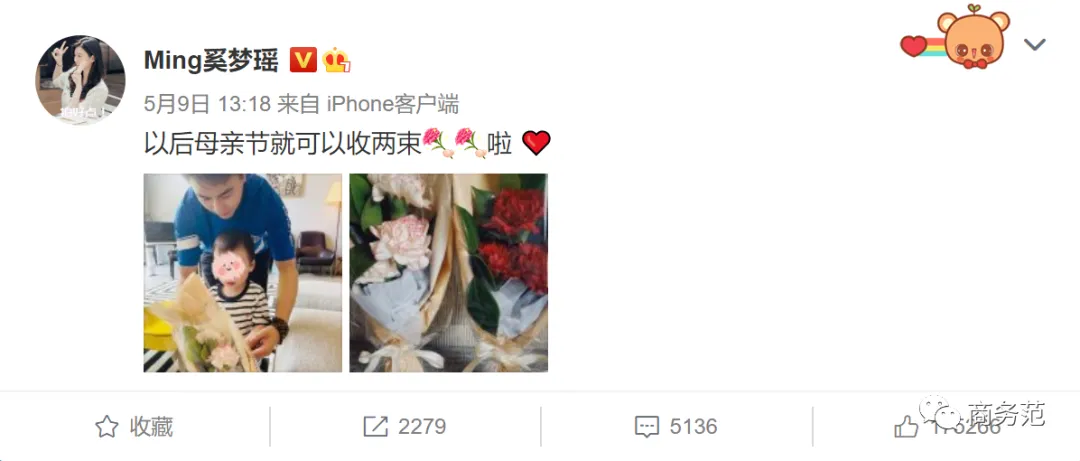 昨天母亲节,奚梦瑶的官宣怀上二胎的微博,引发了不少热议。在微博中,她晒出了何猷君带着儿子给她送花的照片,画面很是温馨。