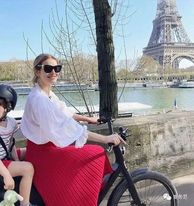 比如前阵子法国也春意正浓,她就骑着单车带娃出行了。减龄可爱的法风泡泡袖白衬衫搭配红色裙子,看起来简单大方,妥妥的温柔辣妈即视感。