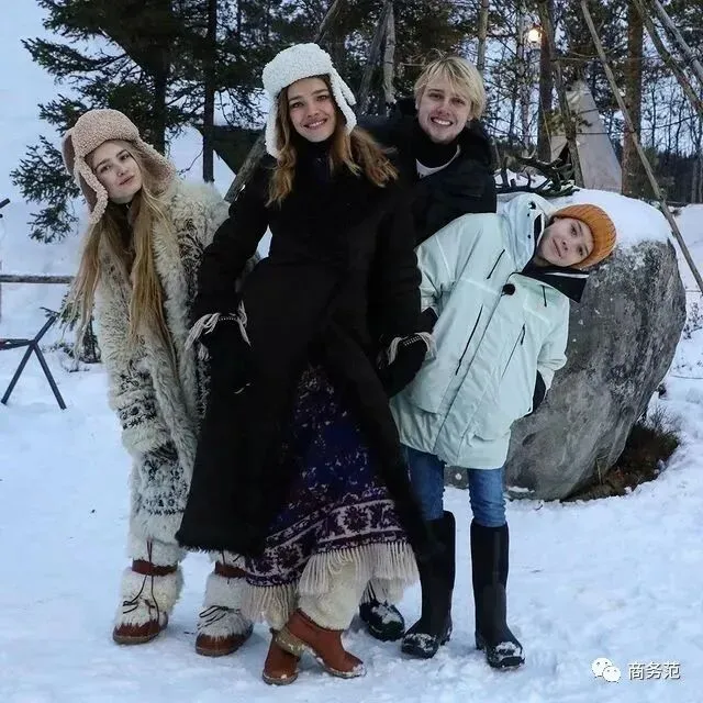 和三个较大一点儿的儿女站在一起,完全就像是同龄人~