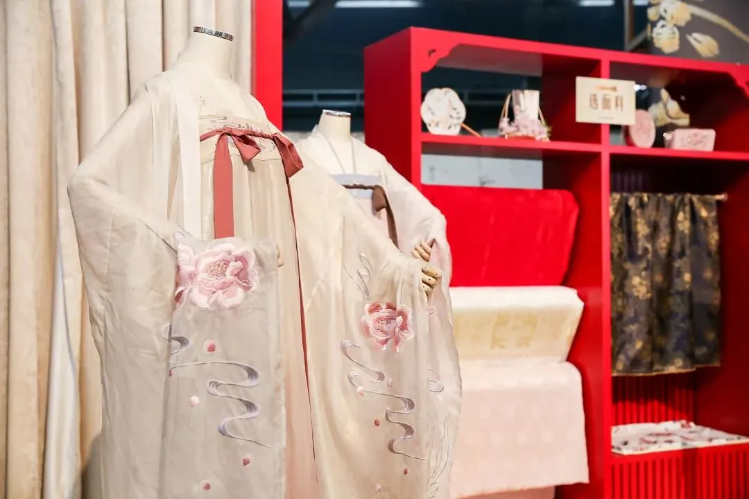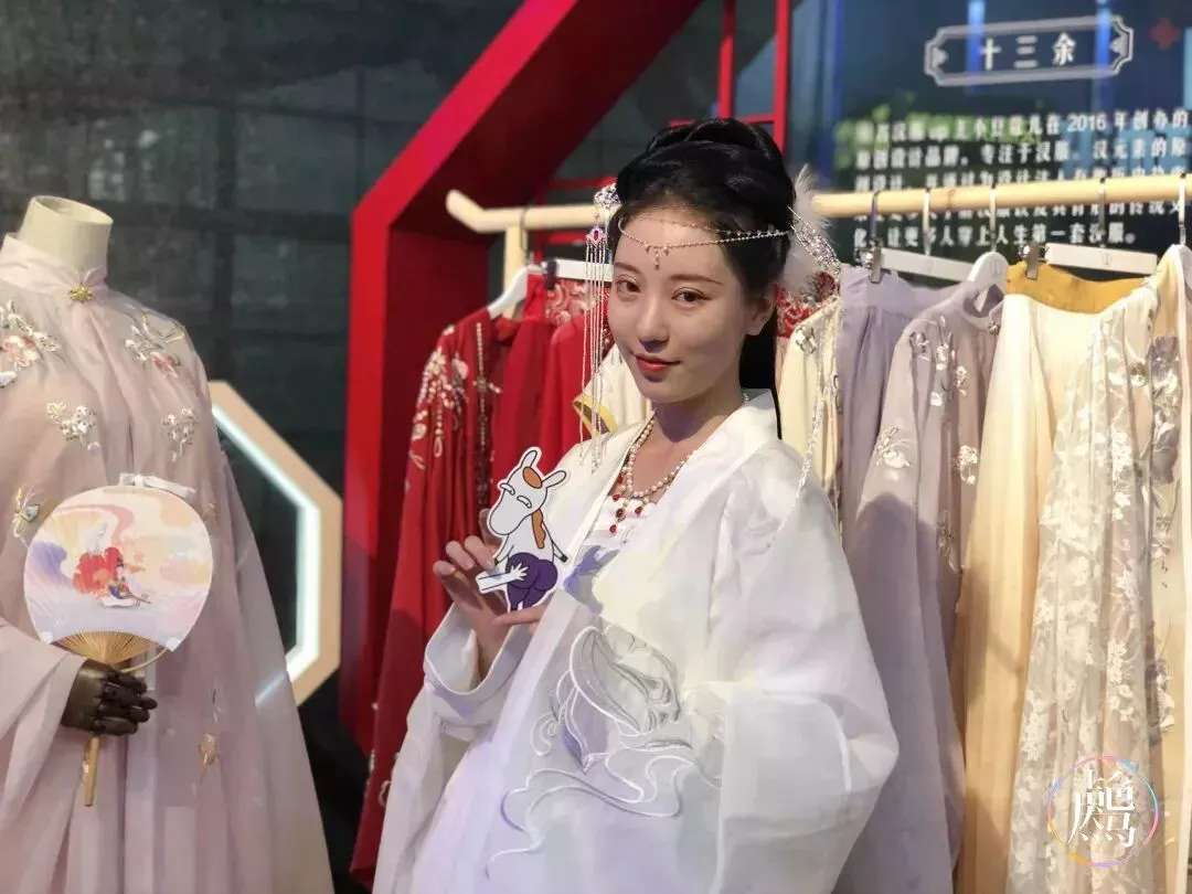 展厅位置也很有意思,汉服高定在“国风区”的最前,正对霓虹灯到处闪的“潮流区”和黑科技扎堆的“科技区”。