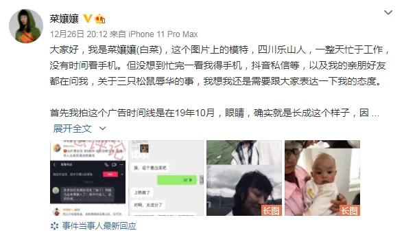 12月26日晚,涉事模特@菜孃孃 也通过社交媒体发声,自称因广告一事遭到部分网民网暴及外貌羞辱。她表示,自己的眼睛本来就长得小,她只是按着要求拍出商家要的东西完成工作,并不是刻意营造所谓的“辱华”形象,希望一些网民不要再私信辱骂她。“我眼睛小就不配做中国人了?爱国我举双手赞成!但事事都要上纲上线,那这就是一种病态了!”(相关链接:三只松鼠模特:我确实长这样...上海市消保委发声:消费圈的审美也要与时俱进