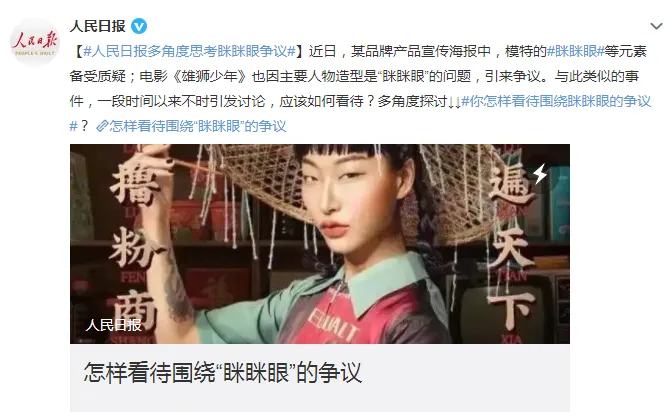 K:应该说,舆论场的反映,很大程度上也折射出公众对美西方辱华标签的警惕,体现出高度的文化自觉。但对“眯眯眼”的讨论,既需要分清对象,更需要分清动机和场景。在艺术创作中故意丑化中国人,甚至以比“眯眯眼”的手势表达歧视,这样的西方偏见,我们不接受,也会有力反驳。爱国是本能,维护民族尊严是每个中国人天然的情绪。不过,如果不分场合、不分情景地认为,眼睛小就是“眯眯眼”,只要使用小眼睛模特一律就是辱华,这多少也有些太过敏感了。可以不同意类似的审美,可以讨论艺术创作的方向,但没必要上纲上线。