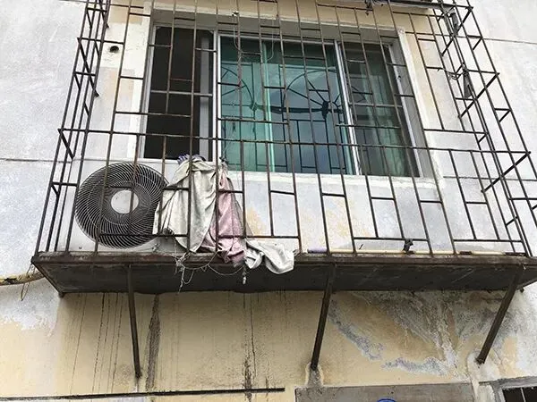 记者在现场看到,这座建于2000年左右的住宅楼墙皮已开始脱落,从门口向上踩过十几个台阶,就到了102室,墨绿色的房间铁门紧锁,从外看与其他房间无异。一楼的阳台处,还披着三四张泛黄发霉的抹布。