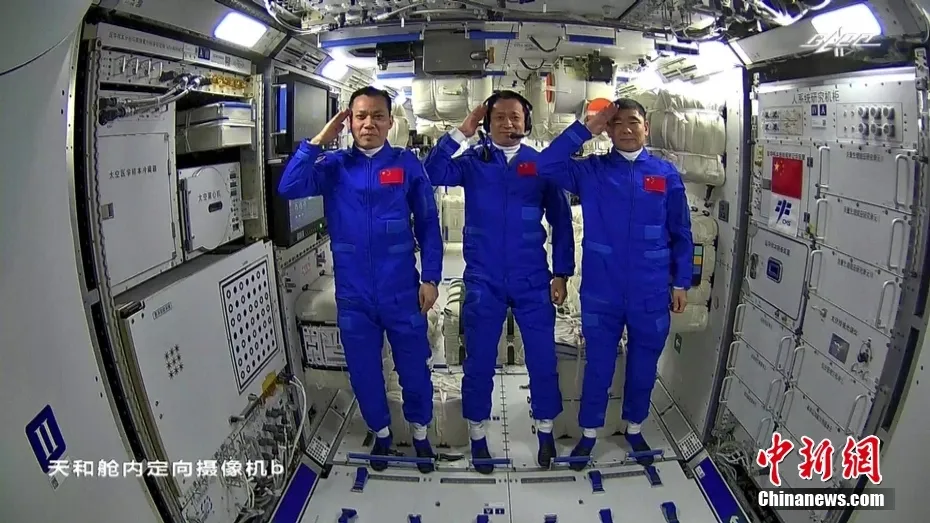 资料图:进入空间站后,三名航天员向全国人民报告并致谢敬礼。(视频截图)图片来源:视觉中国