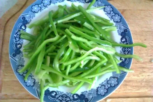 2.青椒清洗干净,沥干水分切丝,装入盘中,青椒选择皮薄一点的,直一点的,青椒去头去尾,中间用刀一片,展开以后,去掉里面的籽,然后均匀的切成细丝,装盘备用。在准备一些姜末,蒜末。