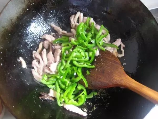 3.锅中倒入食用油,想要肉丝不粘锅,先把锅烧的非常的热,然后在倒油。油温烧至7成热,锅里冒烟的时候,然后端起锅来回摇晃,让油均匀的沾满锅的内壁,然后关火,这一步是热锅,这样子热的锅,不管是炒肉丝,炒肉片,还是煎鱼,都不会粘锅,前提是肉需要先处理一下,然后当油温降下来以后在开火,把肉丝倒入锅中,快速翻炒,肉丝炒至乳白色的时候,把肉丝盛出备用,锅中倒入姜蒜末,翻炒爆香,然后倒入青椒丝,煸炒片刻下入肉丝,加入少许的食盐,鸡精,在来一点点白糖提鲜,大火快速翻炒均匀,出锅之前来两滴香醋,翻炒均匀就可以出锅装盘了。