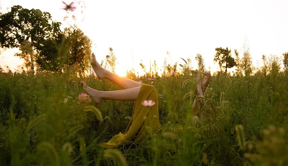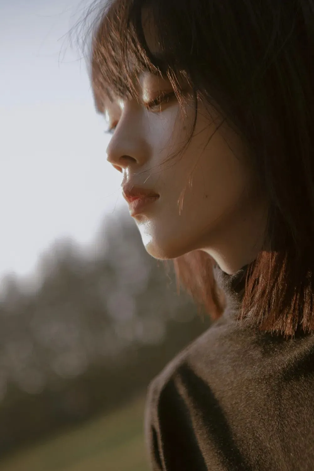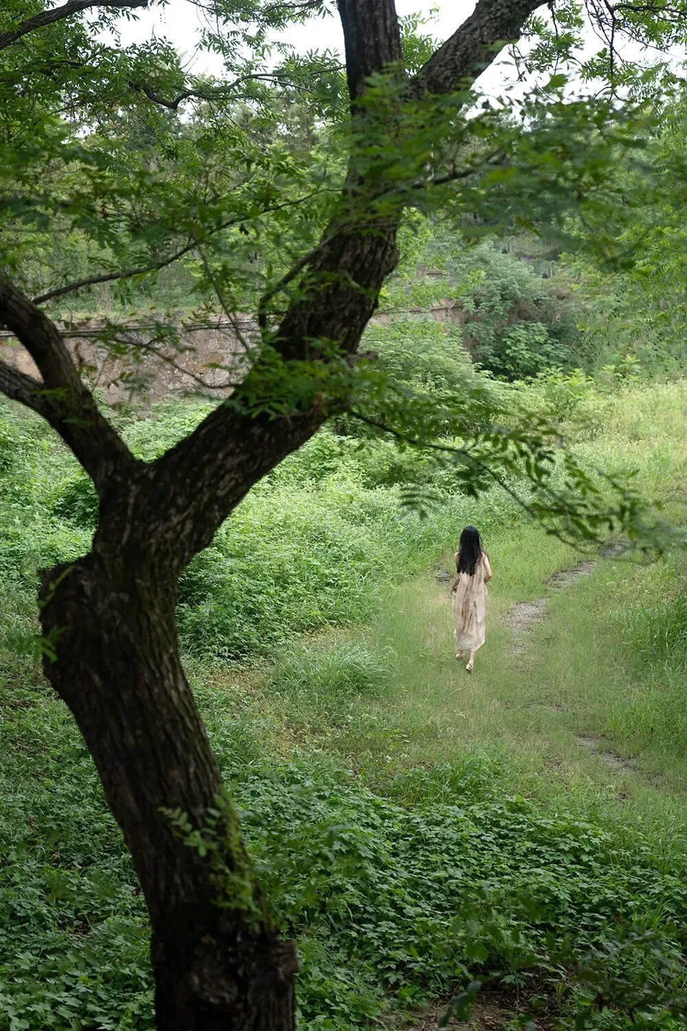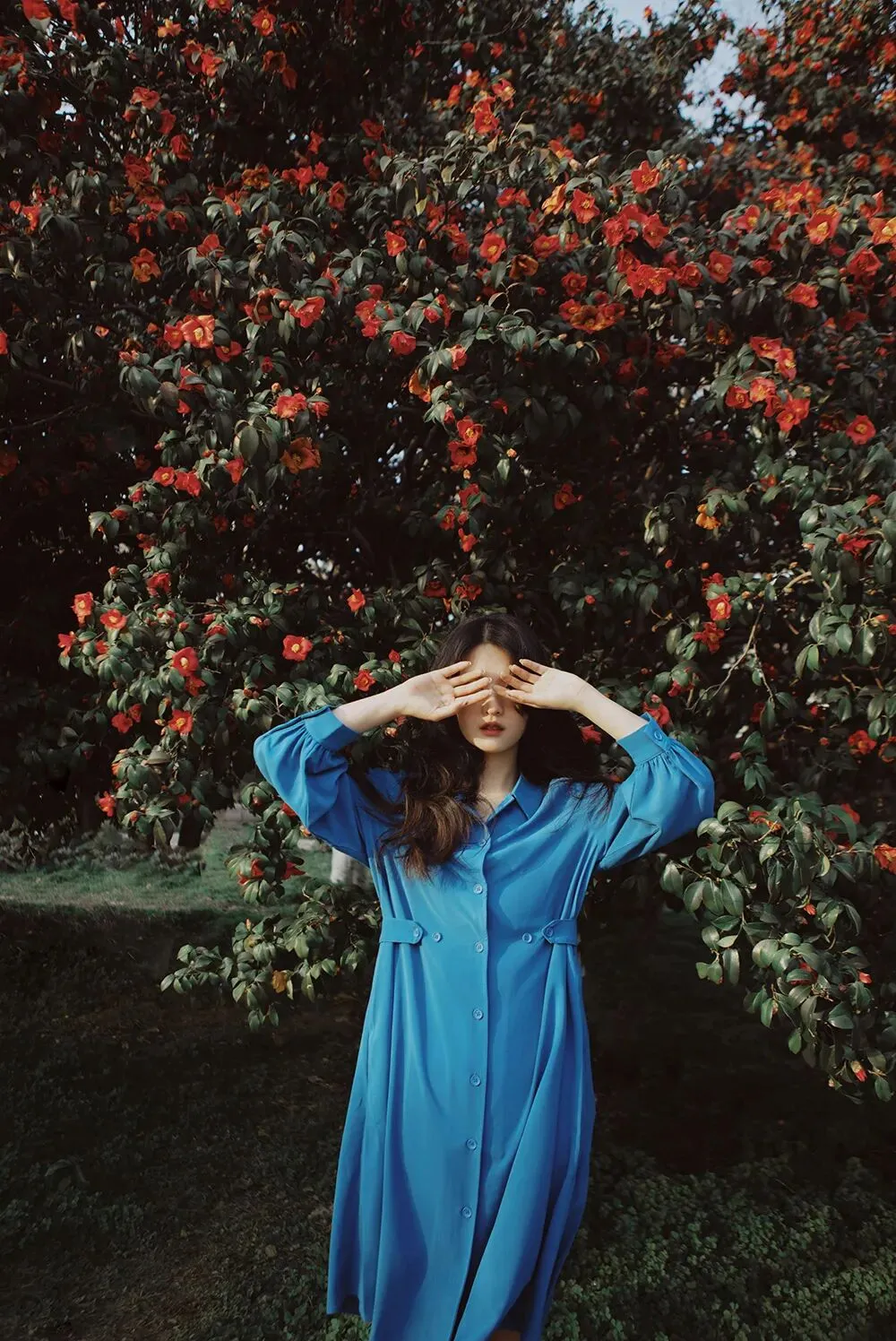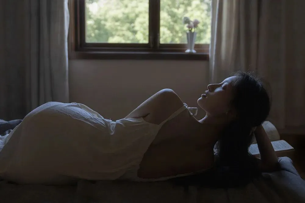 不面向镜头的动作是更有故事感的,所以拍摄时我会让模特专注做自己的事情,或是欣赏美景,或是亲近自然,或者安静的翻一本书,只是当我需要拍摄眼神的时候再让模特看向镜头。眼神在拍摄中也是非常重要的一点,因为眼睛可以体现心灵,眼白太多会破坏整体的美感,眼神既要灵动,也要包含故事,眼睛所看的方向也会引导观者的视线。