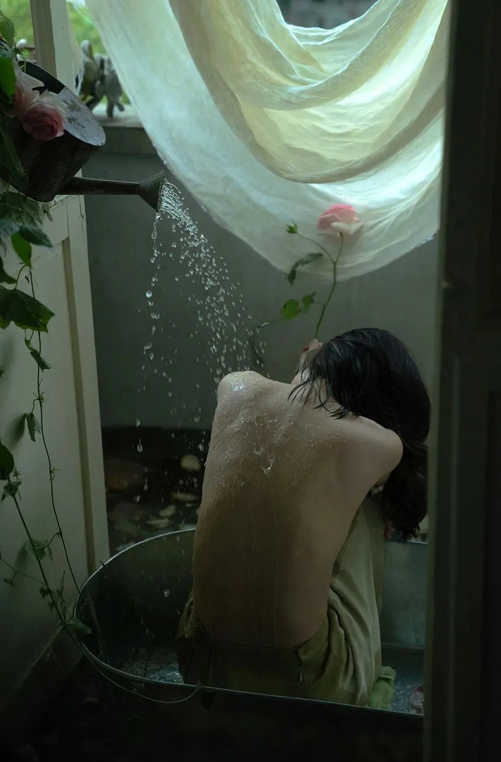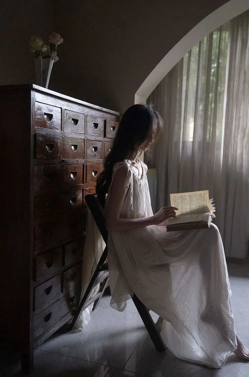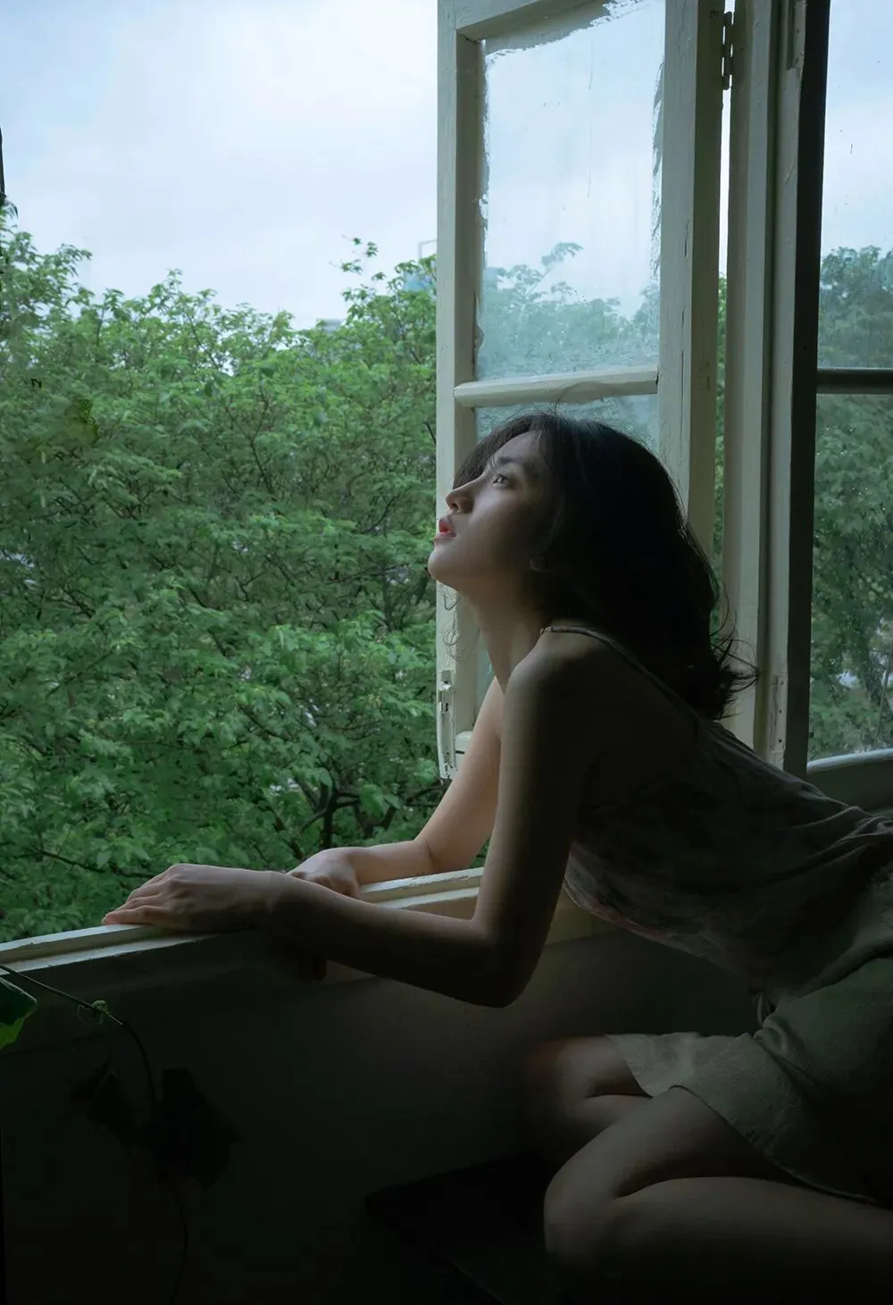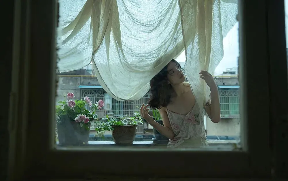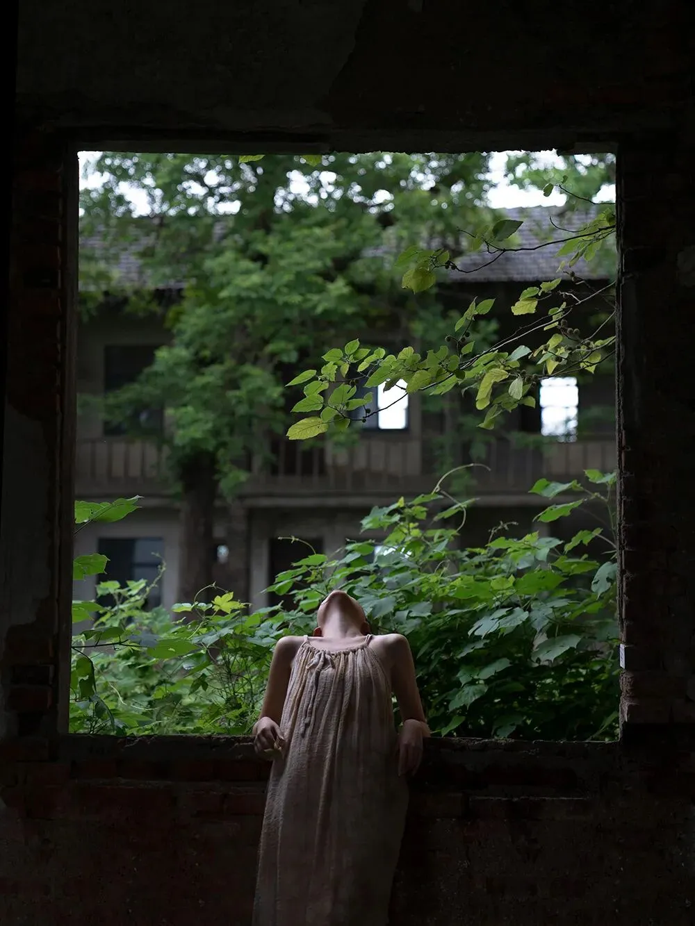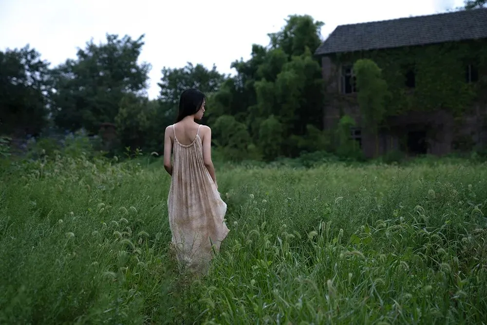 拍摄场景在一个四面被绿色环绕的房子当中,房间里每一扇窗打开时都能看到浓浓的绿意,墙面是低饱和的茶色,装饰和家具也都是偏古朴和宁静的质感。服装选择了亚麻质地的白色系带吊带裙,发型上给模特烫了微卷的卷发,妆容是以淡妆为主,只做了基础的修饰。